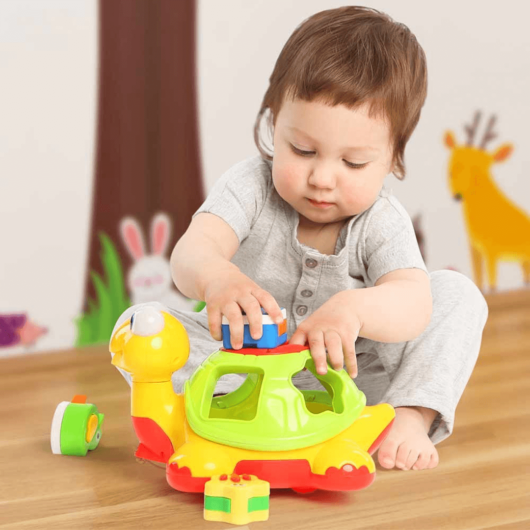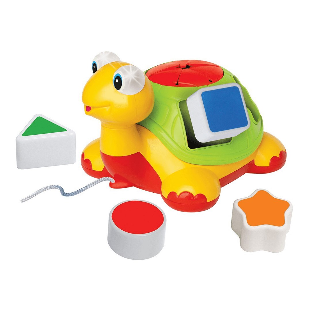 Каталка-сортер, озвучена російською мовою, навчить дитину розрізняти форми, кольори і назви тварин. На панцирі черепашки є 4 отвори різної форми: коло, квадрат, трикутник, зірка. Дитина повинна підібрати фігурки, що входять до комплекту, у відповідні отвори. Якщо малюк впорався зі своїм завданням успішно, черепашка називає відповідну геометричну фігуру, колір або тварину, розповідає віршик про їх властивості або співає веселу пісеньку, сяючи яскравими вогниками. Всі 4 фігурки є трансформерами, які миттєво перетворюються в кумедних тваринок! Іграшка Kiddieland допоможе у розвитку таких навичок, як моторика рук, координація рухів, логіка, вимова, кругозір. Сортер можна катати за собою на мотузочці. Рекомендовано для дітей віком від 12 місяців.