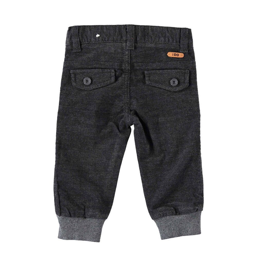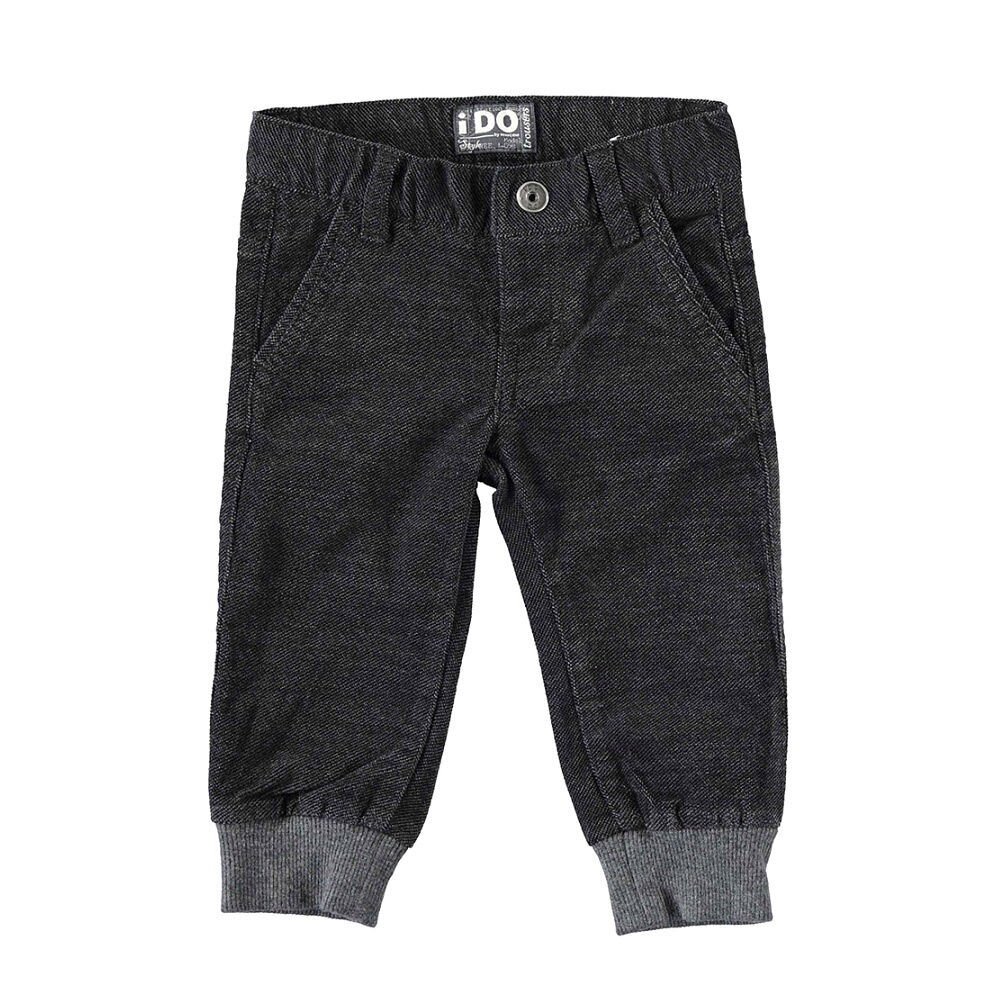 Теплі сірі штани із високою талією зі бавовняної саржі. На талії пояс з м'якою еластичною гумкою та шльовками. Знизу світло-сірі широкі манжети на гумці. Спереду дві врізні кишені з декоративними строчками. Ззаду - кишені обманки у вигляді клапанів на ґудзиках. Штани прикрашає логотип iDO. Застібаються на блискавку та кнопку. Універсальна і стильна модель. Склад: 100% бавовна.