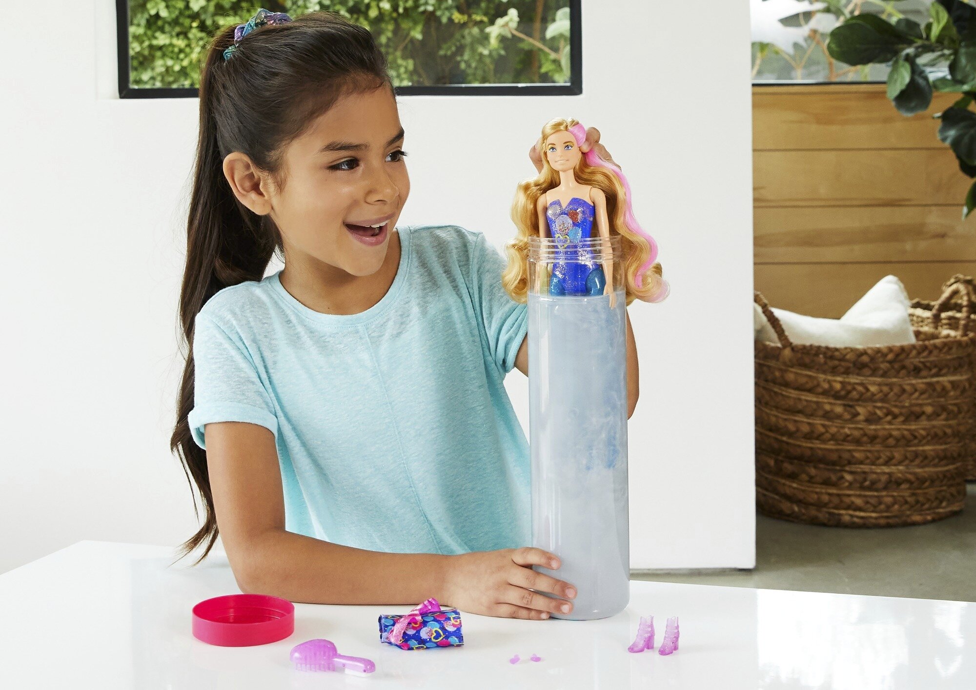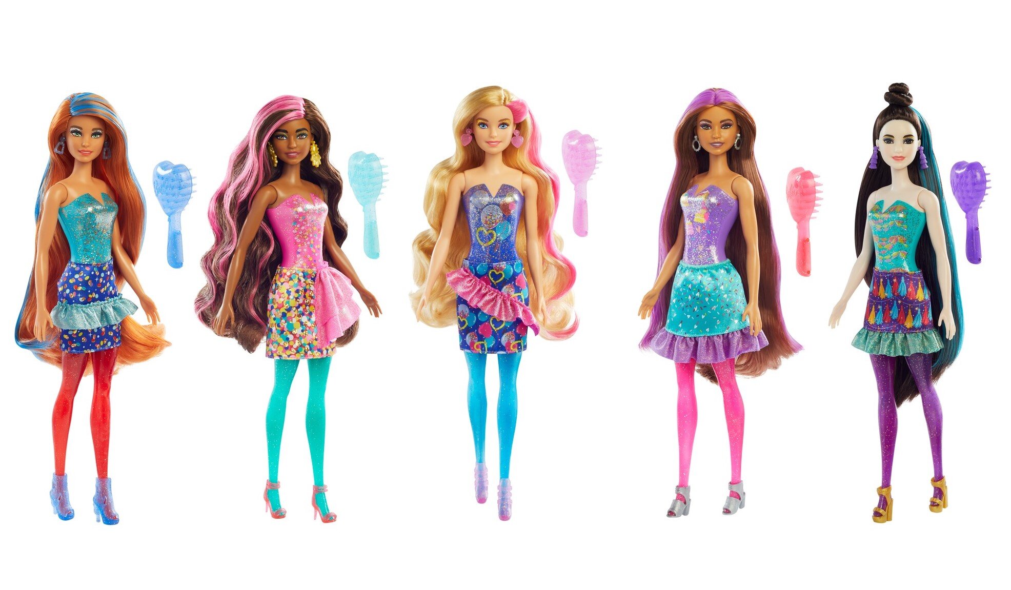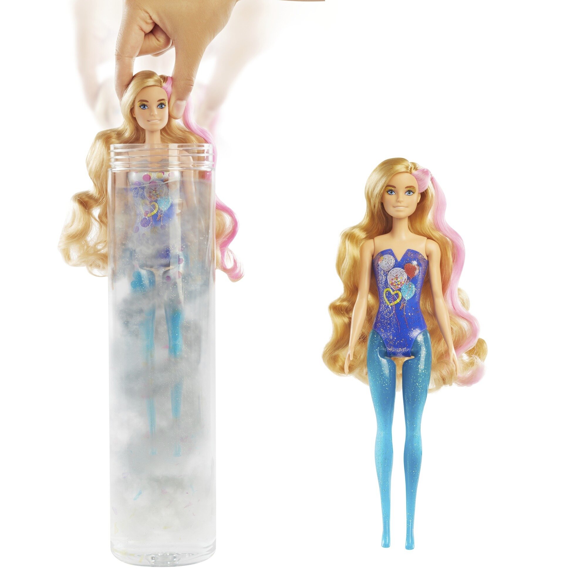 Лялька Barbie Color reveal Вечірка вміє змінювати колір волосся, губів та тіней на повіках! Просто змочіть губку в холодній воді та проведіть по ляльці, і ви побачите магію. Щоби дізнатися, який одяг у ляльки, треба наповнити резервуар теплою водою, опустити її туди (по шию) і трохи покрутити всередині. Коли вода стане кольоровою, тоді іграшка покаже свій стиль.