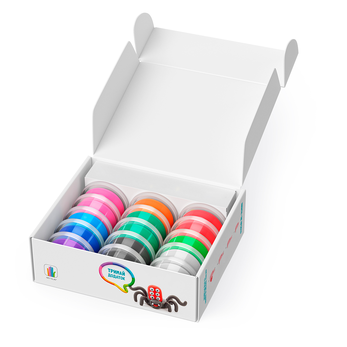 - До меганабору входить 15 баночок пластиліну різного кольору.