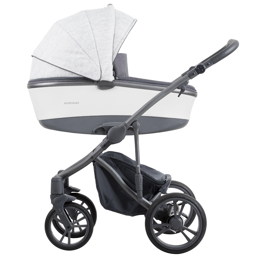 Модель Bresso - це колекція колясок, яка з першого погляду приваблює своєю елегантністю, і в той же час відповідає всім необхідним вимогам, які забезпечують комфорт найвищого рівня. Чорна рама і поєднання тканини і еко-шкіри різних кольорів додають оригінальності дизайну. Рама розроблена таким чином, що забезпечує найкращу амортизацію для дитини, завдяки системі SAS (Shock Absorption System - система поглинання коливань) і DMS (Direction Memory System - система пам'яті напрямку). Люлька розроблена таким чином, щоб забезпечити дитині провітрювання - через вентиляційне віконце-сіточку у верхній частині капюшона, або ж через отвори, які закриваються розсувною решіткою в днищі люльки. Подовжений капюшон-батискаф дає можливість оптимального застосування в залежності від погоди - захищаючи від поривів холодного вітру або занадто сильного сонячного випромінювання. Варто зазначити, що подовження капюшона не вимагає відкриття вентиляційного віконця-сіточки. Оббивка зі вставкою UV50 + забезпечує високий захист від шкідливого ультрафіолетового випромінювання.