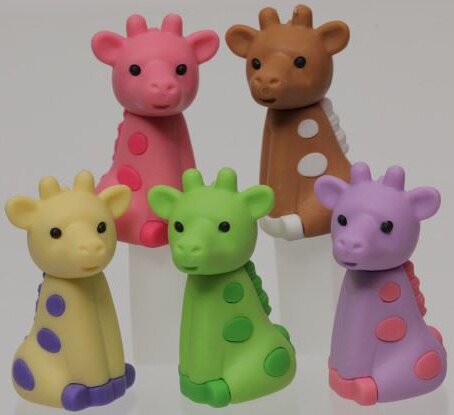 Кумедні фігурні гумки Iwako виготовлені з високоякісного каучуку у вигляді різних жирафів. Гумки містять вставні елементи, завдяки чому вони можуть використовуватися як навчальна та розвивальна іграшка. Гумка Iwako стане незамінним аксесуаром на столі школяра, студента або офісного працівника.