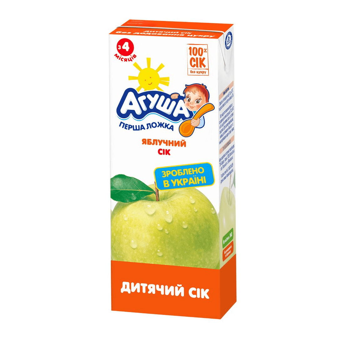 Натуральний освітлений яблучний сік "Агуша" підходить для першого прикорму у відповідності з віковими рекомендаціями. Для дітей з 4 місяців. Не містить цукор, консерванти, барвники. Гіпоалергенний, що доведено клінічно. Передбачає 72 перевірки якості продукту - від збору фруктів, виробництва, пакування до доставки у магазин. Зберігати 12 місяців при температурі від 0°С до +25°С та відносній вологості повітря на вище 75%. Після відкриття упаковки продукт зберігати в холодильнику при температурі від +2°С до +6°С не більше доби.