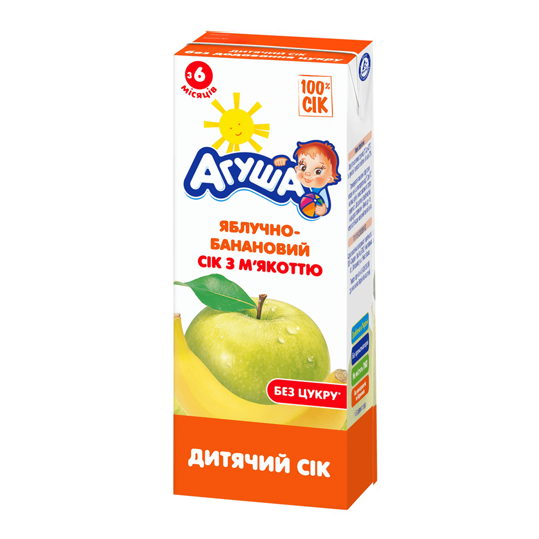 Натуральний яблучно-банановий сік "Агуша" підходить для першого прикорму у відповідності з віковими рекомендаціями. Для дітей з 6 місяців. Не містить цукор, консерванти, барвники. Гіпоалергенний, що доведено клінічно. Передбачає 72 перевірки якості продукту - від збору фруктів, виробництва, пакування до доставки у магазин. Зберігати 12 місяців при температурі від 0°С до +25°С та відносній вологості повітря на вище 75%. Після відкриття упаковки продукт зберігати в холодильнику при температурі від +2°С до +6°С не більше доби.