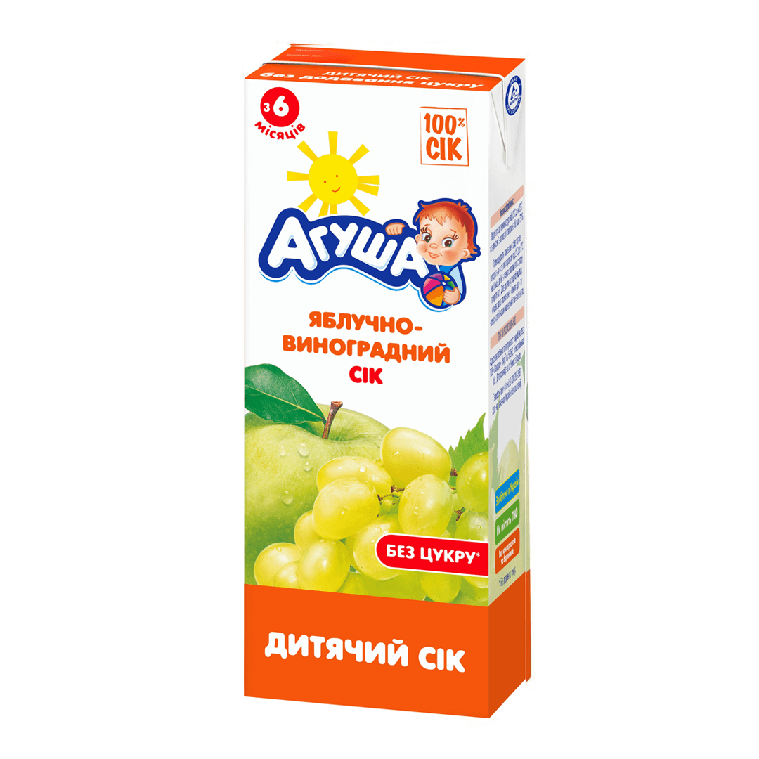 Натуральний яблучно-виноградний сік "Агуша" підходить для першого прикорму у відповідності з віковими рекомендаціями. Для дітей з 6 місяців. Не містить цукор, консерванти, барвники. Гіпоалергенний, що доведено клінічно. Передбачає 72 перевірки якості продукту - від збору фруктів, виробництва, пакування до доставки у магазин. Зберігати 12 місяців при температурі від 0°С до +25°С та відносній вологості повітря на вище 75%. Після відкриття упаковки продукт зберігати в холодильнику при температурі від +2°С до +6°С не більше доби.