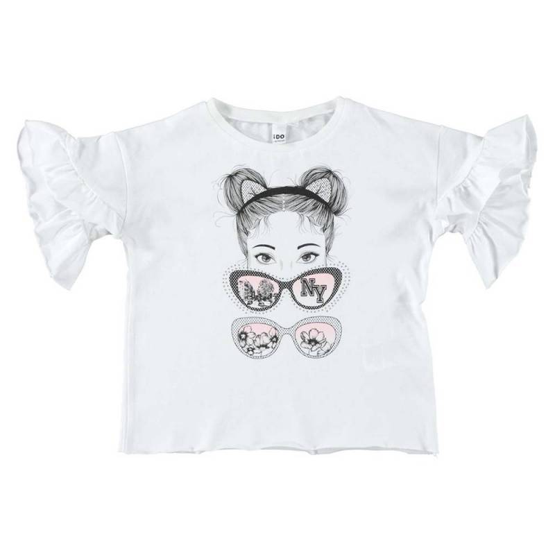 Супер стильна футболка, що спереду прикрашена стразами і принтом. Рукава пишні завдяки оборкам в кілька рядів. Ідеально підходить для спекотних літніх днів Вашій дівчинці! Склад: 100% бавовна. Колір білий. Дитячий одяг бренду iDO - це висока європейська якість і кращі модні тренди.
