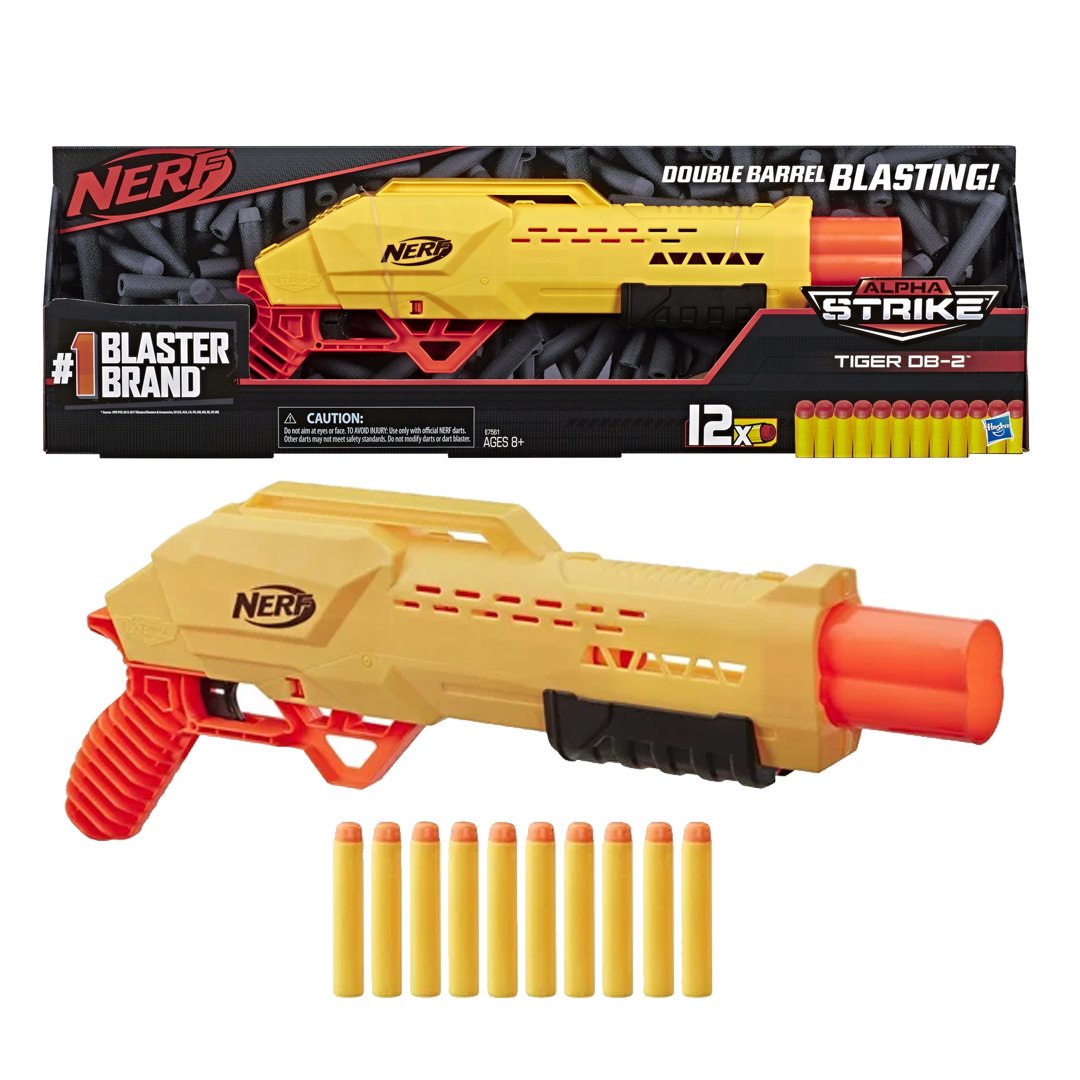 Тайгер DB-2 - механічний бластер подвійної дії (з двома стволами) з нової серії Нерф Альфа Страйк. Зброя призначена для швидкої гри, рекомендована від 8 років. Має приціл і дві точки кріплення ременя. Заряджайте стріли в отвір збоку кожного стволу. Принцип той же, що й у моделі Double Breach. Після цього зведіть затвор, прицільтесь і – натискайте на курок! Після одного пострілу стріляйте знову і тільки потім вам необхідно зарядити 2 нові стріли. До комплекту, крім бластера, входять 12 оригінальних стріл Nerf Elite для багаторазових перезавантажень. Бластери Nerf Alpha Strike використовують стріли стандартного розміру. Сумісні зі стрілами інших серій Nerf (крім Nerf Mega і Ner Rival). Елементи живлення для гри не потрібні. Артикул 61035.