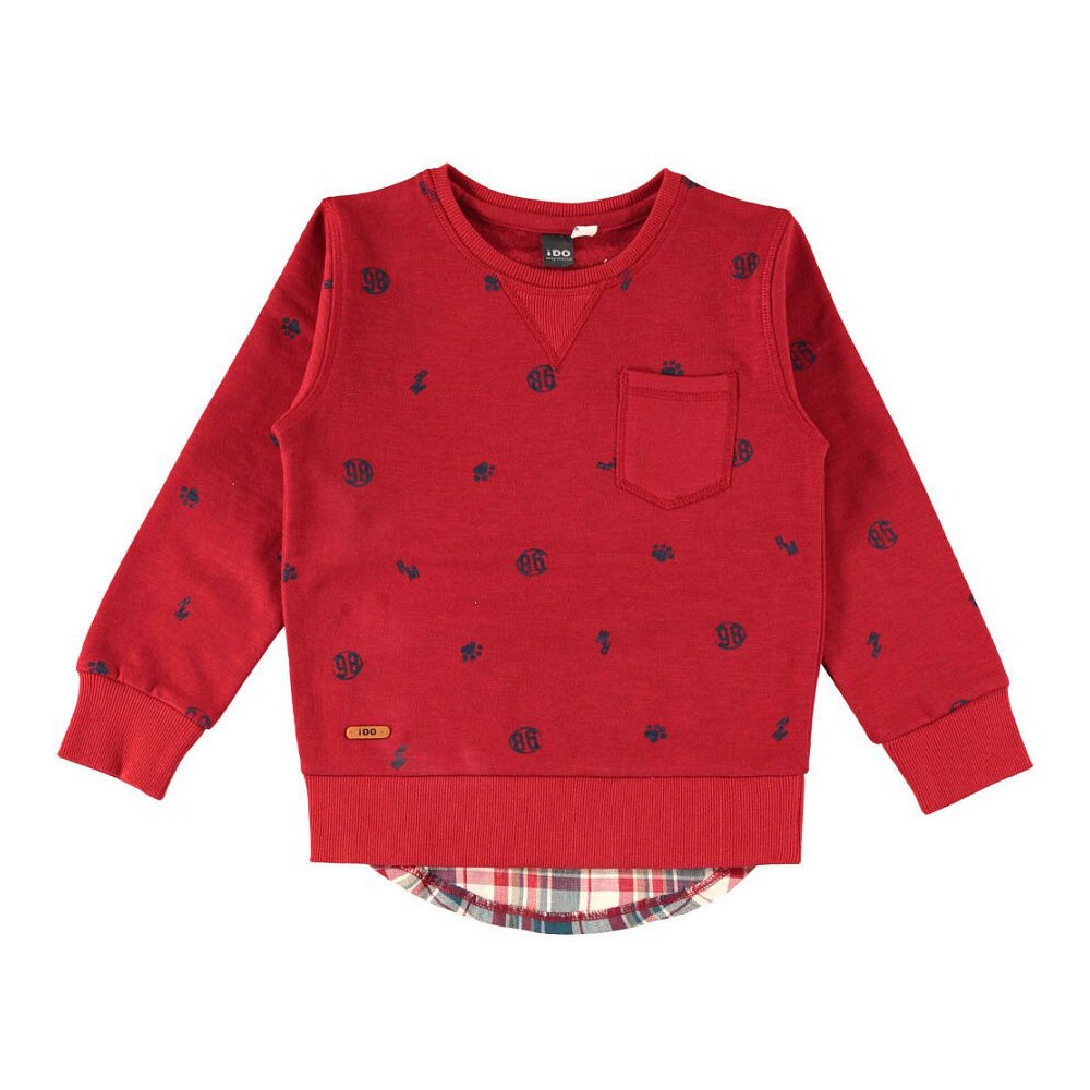 Яскравий та практичний хлопчачий светр IDO на весну та осінь. Толстовка вільного крою виготовлена з червоного трикотажу. Модель має круглу горловину, манжети-гумки внизу та на рукавах. Светр декорований чорним принтом, накладною кишенею на грудях, вставками, що імітують трикутний виріз горловини та низ клітчастої сорочки. Склад: 100% бавовна.