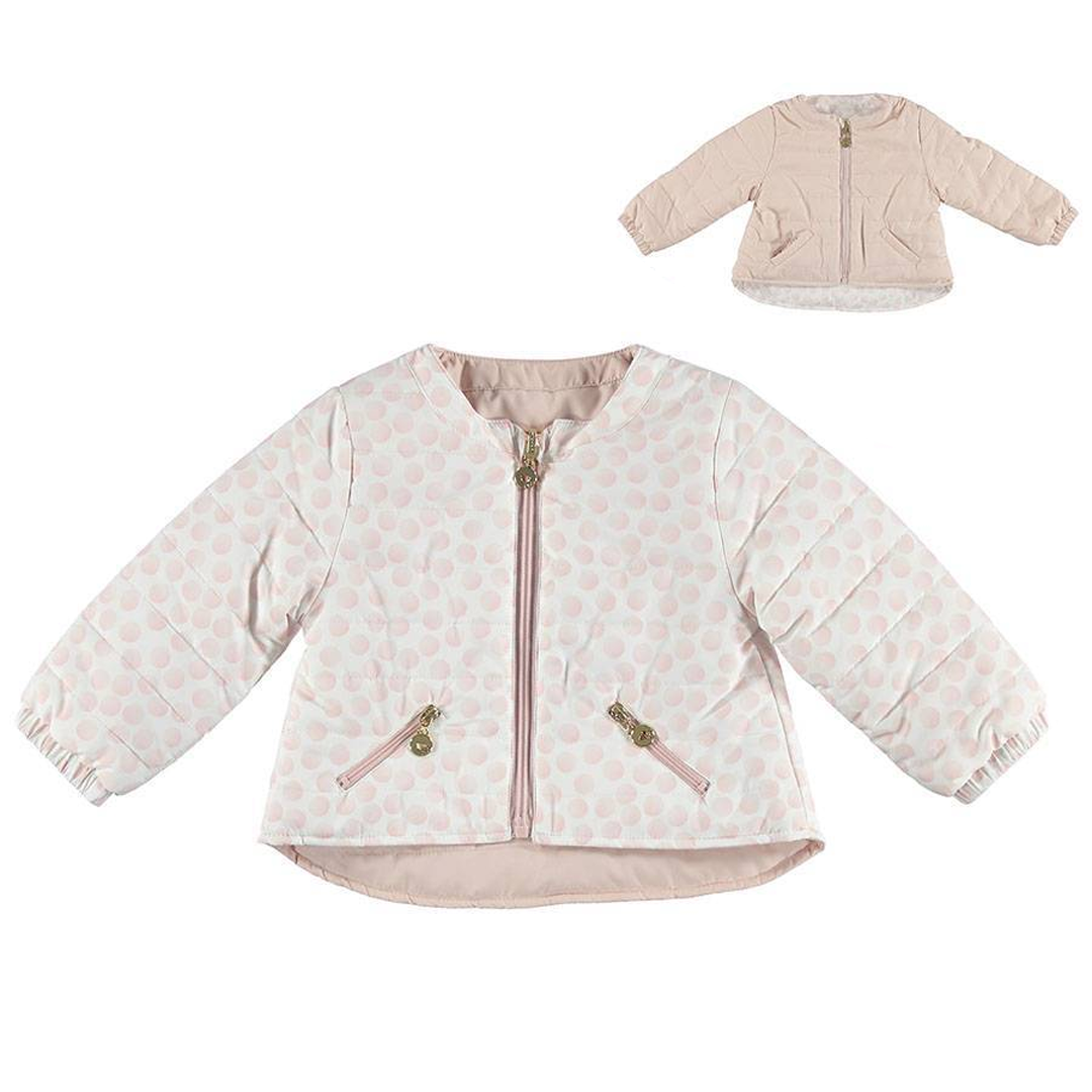 Легка стьобана куртка для дівчаток 3 років на теплу весну та осінь. Виготовлена італійським виробником iDO, що спеціалізується на зручному та функціональному повсякденному дитячому одязі. Модна коротенька куртка без капюшону утеплена тонким шаром синтепону (100 г). Вона двостороння: зовнішня частина - однотонна, пудрового відтінку, внутрішня - біла в блідо-рожевий горох. Матеріал - поліестер. Застібається на блискавку з золотим покриттям. З обох сторін є вшиті кишені на блискавках. Всі моделі колекції легко поєднуються між собою, і створюють яскравий, оригінальний образ. iDO - це саме ті речі, які надають впевненості і говорять про добрий смак батьків.