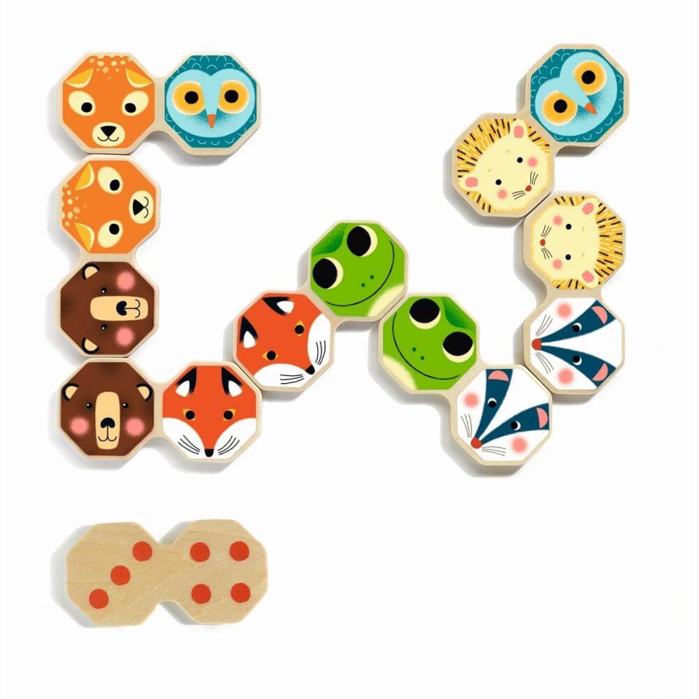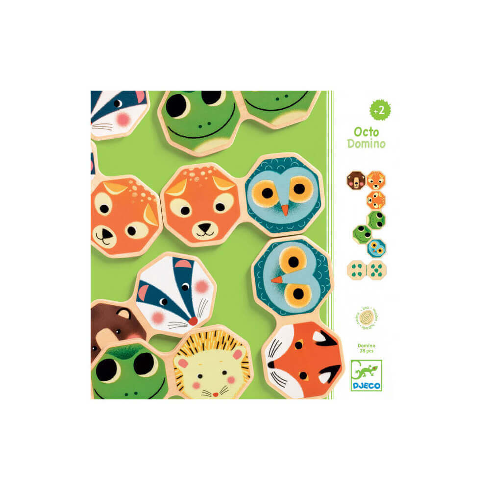 "Мордочки" від DJECO - захоплююче доміно для найменших малюків (від 2-х років). Гра розрахована на 2 - 4 учасників, розвиває кольорове та просторове сприйняття, логіку, мову, образне мислення. У комплекті: 28 елементів із зображеннями мордочок тваринок. Пластини доміно виготовлені з добре обробленої деревини, розмальовані безпечними фарбами на водній основі. Завдання гравців - зіставляти однакові мордочки.