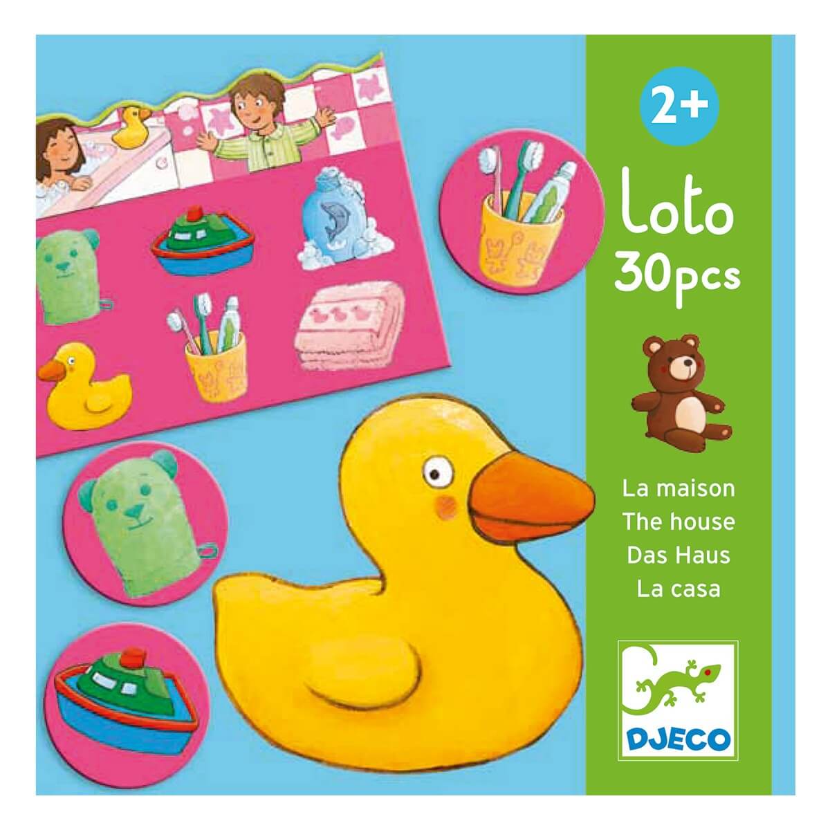 Діти дуже добре схоплюють нові знання під час гри, тому бренд DJECO розробив дитяче лото "Будинок". Тут на картинках діти виконують повсякденні справи. Вони як і всі малюки їдять, грають, вмиваються, купаються і лягають спати. За допомогою яскравих картинок можна простежити розпорядок дня.