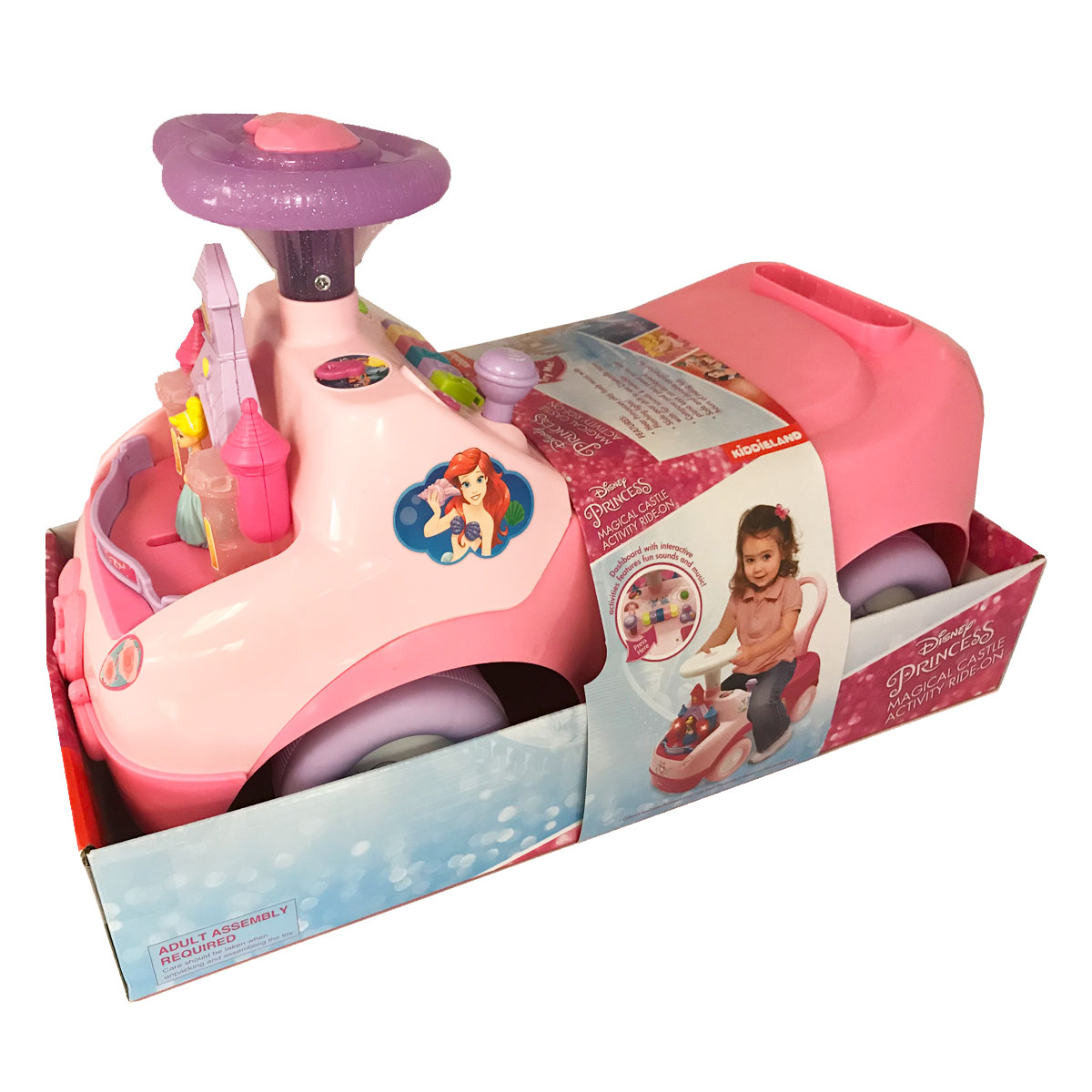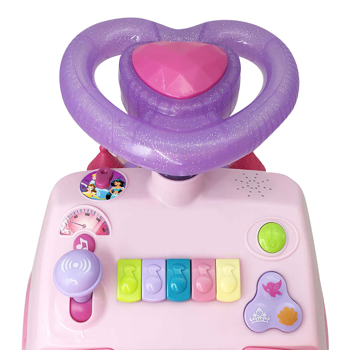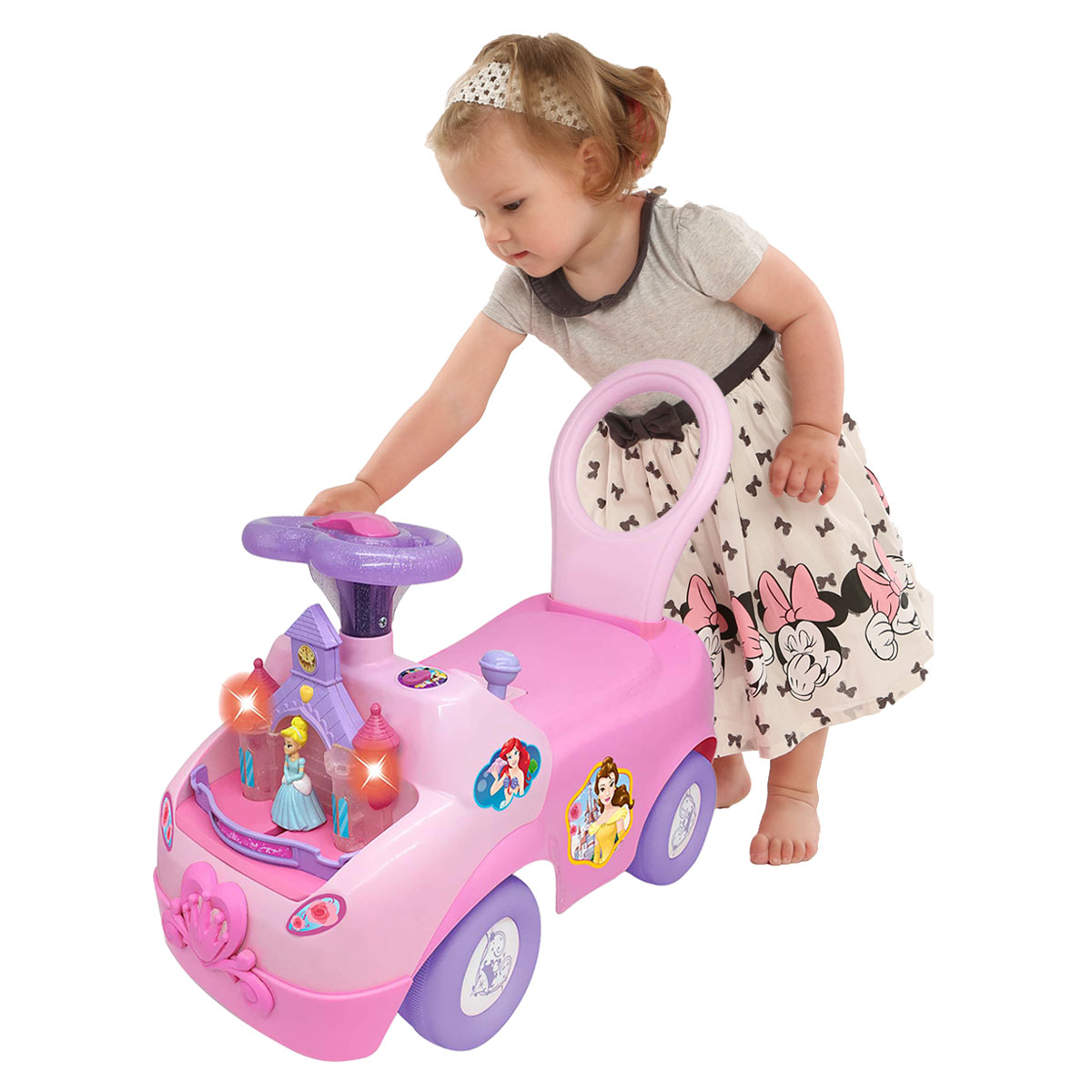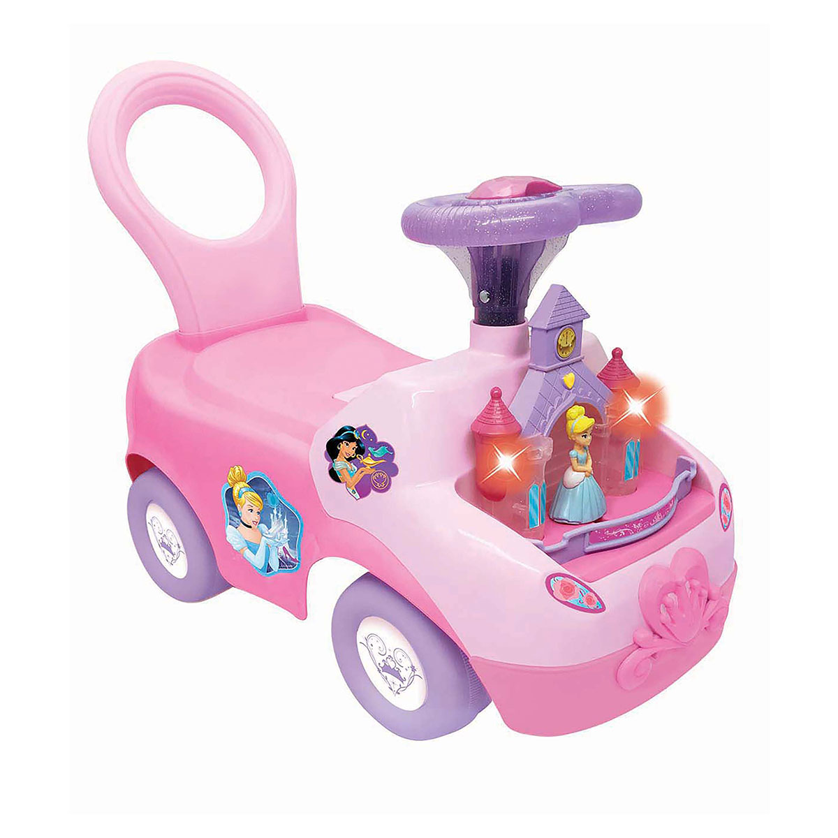 Елегантний дивомобіль для маленьких принцес, виконаний в стилі популярного мультфільму студії DISNEY, розважить дитину миготливими вогниками, приємними мелодіями, забавними звуками, а також реалістичними звуками двигуна і сигналу. На панелі управління розміщено піаніно з різнокольоровими клавішами, безліч функціональних кнопок і важелів. На капоті встановлений казковий замок принцеси. Потягніть за важіль, і Попелюшка почне рухатися під чарівні мелодії і звуки. Упаковка презентаційно-відкрита. Живлення: 2 батарейки AA (входять в комплект). Рекомендовано для дітей старше 1 року.