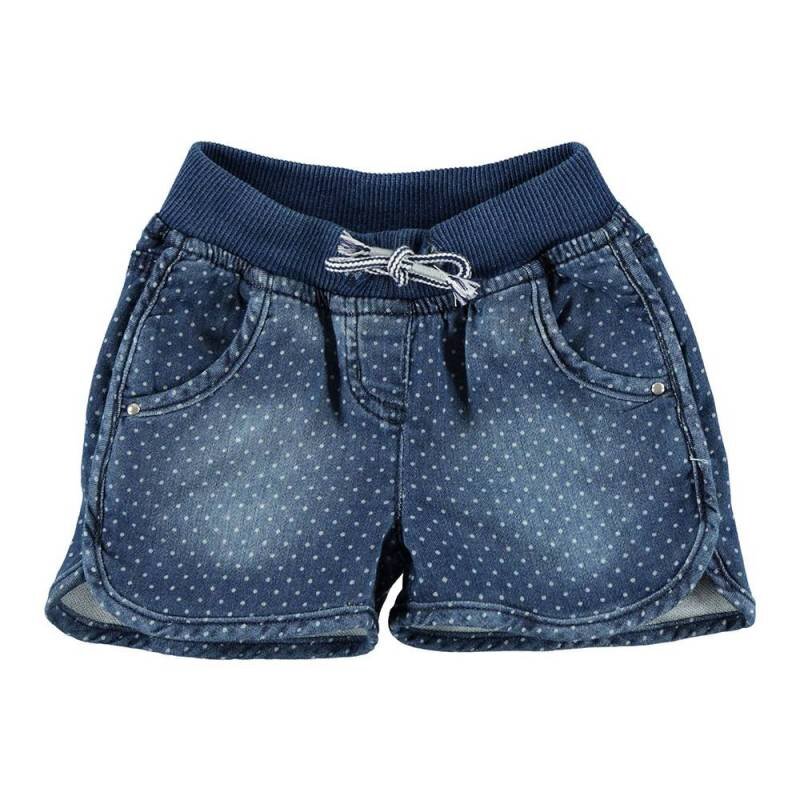 Короткі шорти з синього трикотажу (джинс) для маленьких модниць. Довжина - вище коліна. Дві прорізні кишені спереду. Дві накладні кишені ззаду. Регульована талія з синім поясом-гумкою та втягнутим білим шнурком. Декоровані милим принтом "горох". Дитячий одяг бренду iDO - це висока європейська якість і кращі модні тренди. Склад: 99% бавовна, 1% еластан.