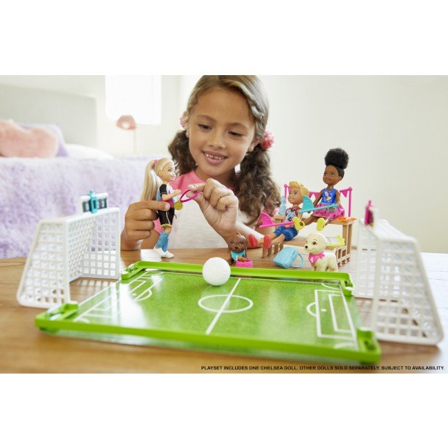 Набір складається з двох воріт з регульованим табло, які прикріплюються до ігрового майданчику, де лялька може грати в футбол. Натисніть на плечі ляльки, щоб вона могла вдарити по м’ячу ногою! Друзі Челсі (до комплекту не входять) можуть спостерігати за грою і "вболівати" за неї, сидячи на трибунах.