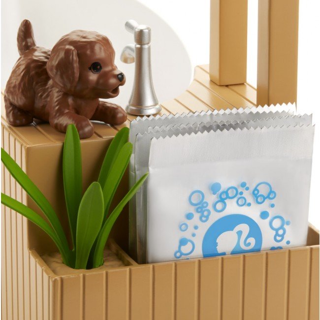 Предмети, що входять у комплект - підставка для ванни, засоби для ванни, щітка і рушник - допоможуть Barbie розслабитися. Спа-процедури чудово заспокоюють. На поличці "під дерево" достатньо місця, щоб розмістити всі аксесуари, вазон з квітами, а також посадити цуценя. У деяких предметів є ручка, щоб ляльці було зручно їх тримати.