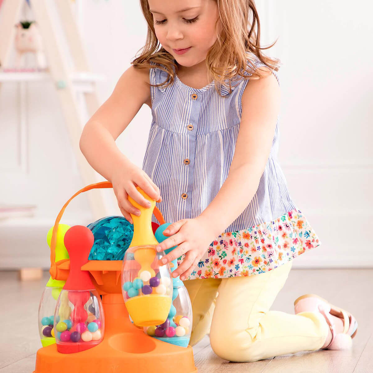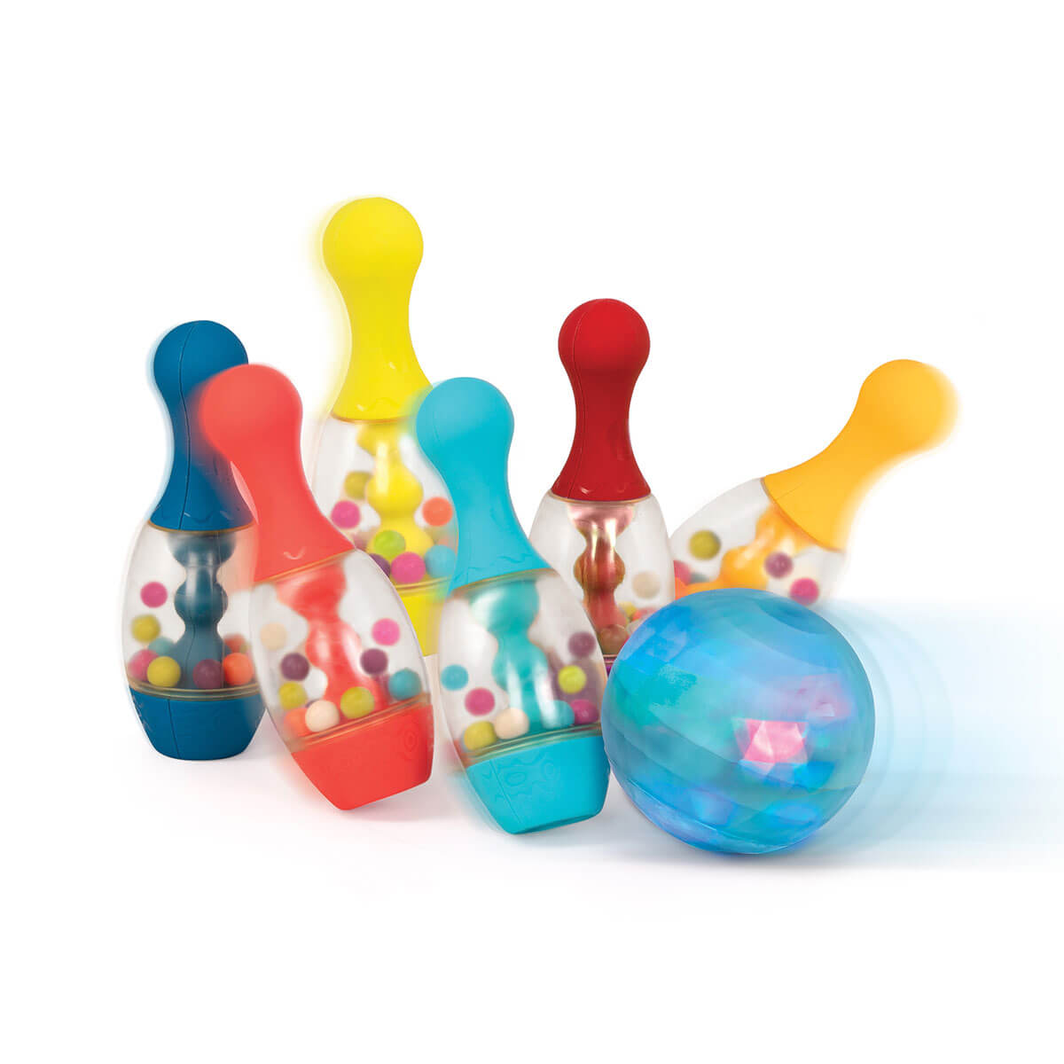 Дитячий боулінг - це чудова можливість для Вашої дитини відмінно провести час в компанії друзів за веселою грою. Правила досить прості: дитині необхідно за найменше число кидків збити всі кеглі за допомогою кулі, що світиться. Гра покращує рухливість дітей, розвиває влучність, координацію рухів і зміцнює м'язи. У набір входить: 6 кеглів, куля, підставка, 3 батарейки AG10 (в комплекті - незмінні, розраховані орієнтовно на 300 циклів, термін служби залежить від частоти гри). Розмір: 25 х 25 х 25 см.
