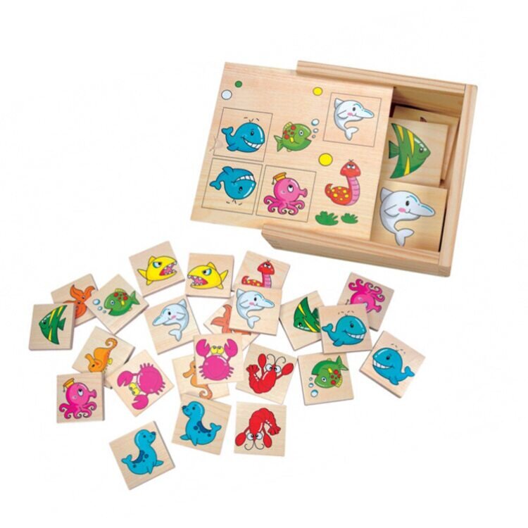 Гру можна розділити на два види по складності. Для маленьких діток викладіть дерев'яні квадратики картинками вгору, а дитинці потрібно відшукати пари морських тварин і називати їх назви. Для діток старшого віку ми ускладнимо гру розкладаючи квадратики зображеннями вниз.