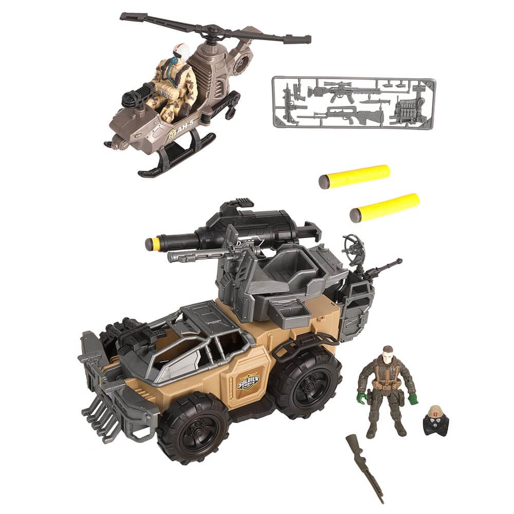 Захопливий ігровий набір від торгової марки Chap Mei запрошує дитини до цікавої сюжетно-рольової гри на військову тематику. До набору входить: деталізований швидкісний автомобіль з рухомою гарматою, 2 рухомих фігурки солдатів з точками артикуляції та можливістю фіксації зброї у руках, аксесуари. Всі елементи набору виготовлені з сертифікованого та безпечного пластику, стійкого до механічних пошкоджень. Гра з набором розвиває образне мислення та просторове сприйняття, тренує дрібну моторику, вчить грати в команді, дає простір для уяви та творчих здібностей. Рекомендований вік - від 3-х років.