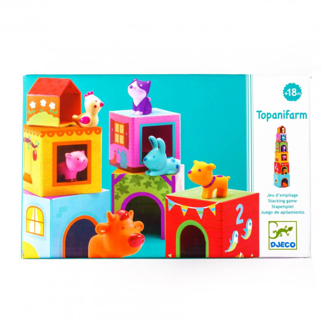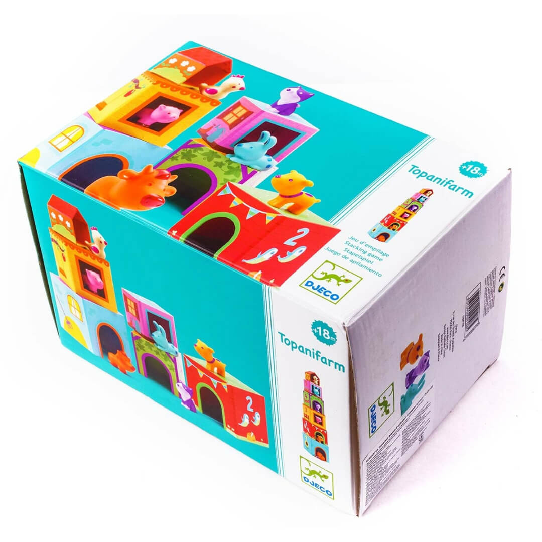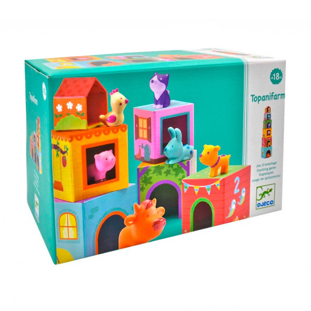 "Topanifarm" - це яскрава розвиваюча іграшка від DJECO для малюків 1 - 3 років. У наборі - 6 "поверхів", що нагадують кубики, та 6 фігурок тваринок: коровки, собачки, котика, курочки, кролика, свинки. Кубики відрізняються розміром, кольором. На кожному є цифра та малюнок, за яким необхідно визначитися, якій тваринці належить "кімната". Кубики складаються за принципом пірамідки: менший ставиться на більший. Останнім буде горище, де мешкає курочка. Така гра розвиває просторове та кольорове сприйняття. Завдяки їй малюк дізнається про поняття "більший", "менший", цифри, свійських тварин.
