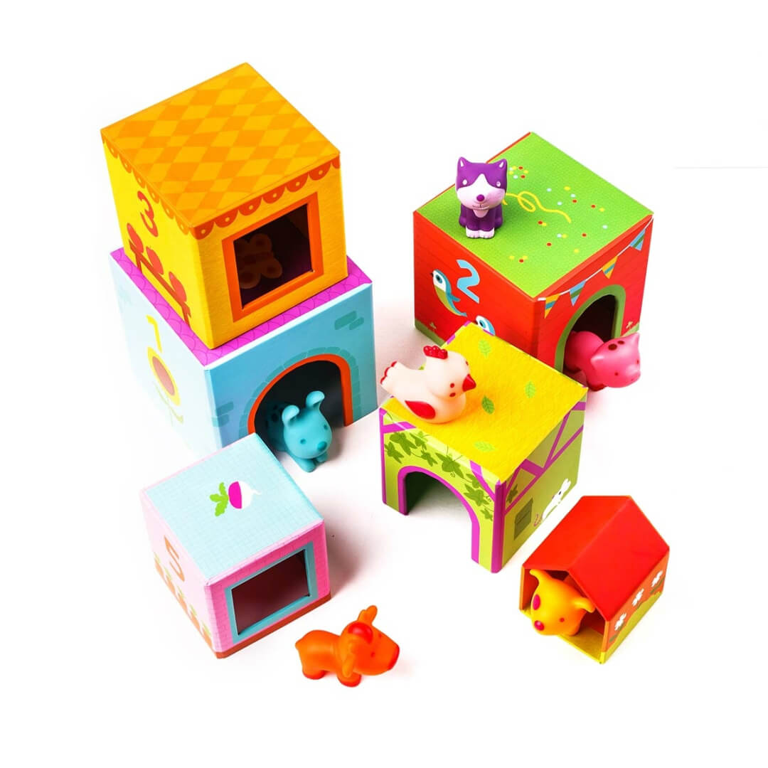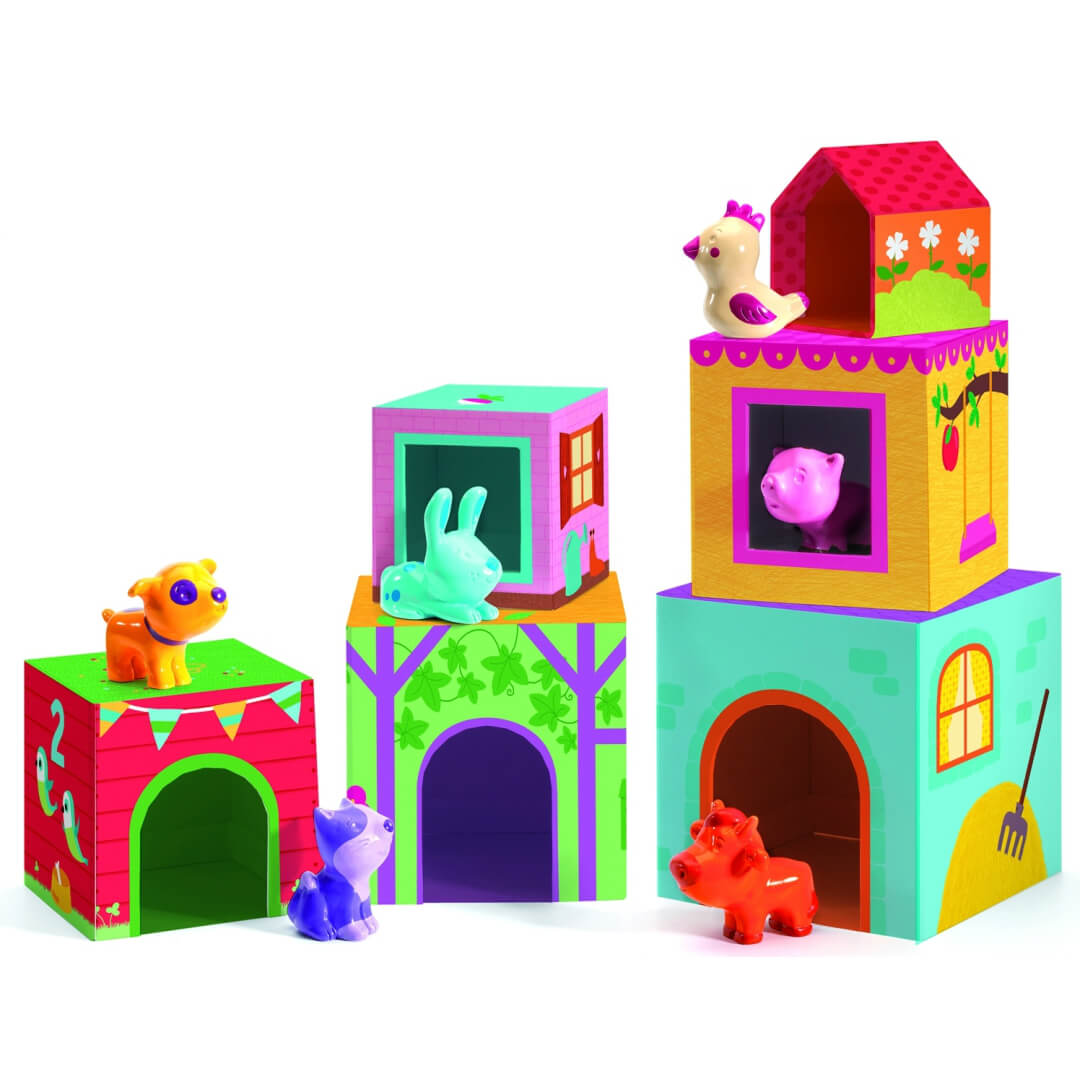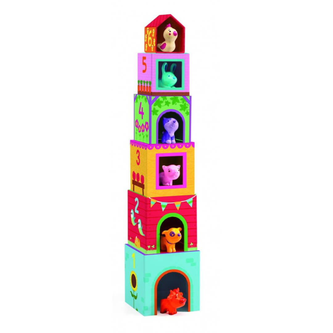 "Topanifarm" - це яскрава розвиваюча іграшка від DJECO для малюків 1 - 3 років. У наборі - 6 "поверхів", що нагадують кубики, та 6 фігурок тваринок: коровки, собачки, котика, курочки, кролика, свинки. Кубики відрізняються розміром, кольором. На кожному є цифра та малюнок, за яким необхідно визначитися, якій тваринці належить "кімната". Кубики складаються за принципом пірамідки: менший ставиться на більший. Останнім буде горище, де мешкає курочка. Така гра розвиває просторове та кольорове сприйняття. Завдяки їй малюк дізнається про поняття "більший", "менший", цифри, свійських тварин.