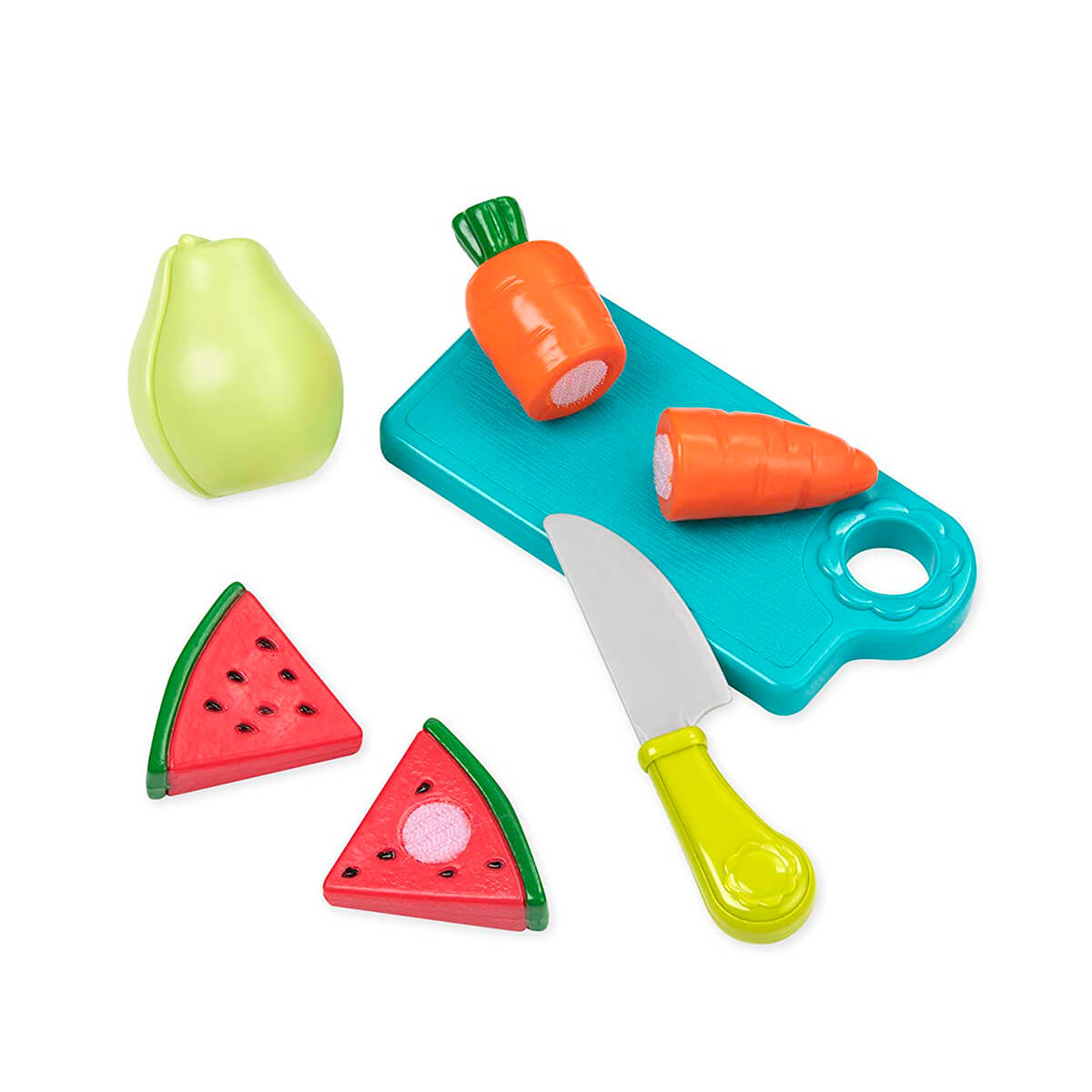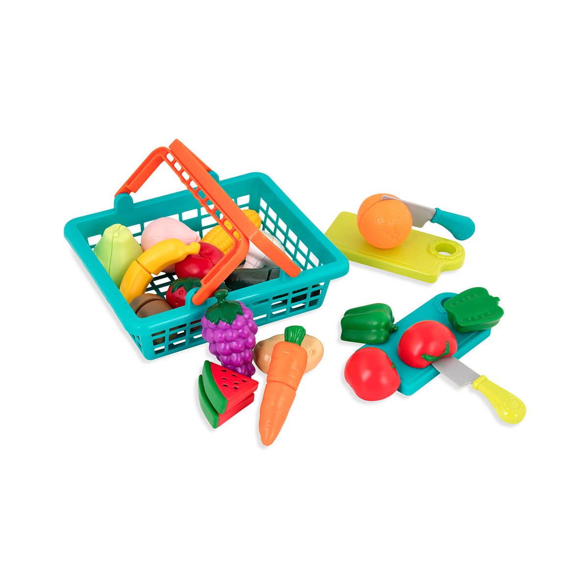 Ігровий набір, з яким дитина довідається більше про корисні продукти харчування - овочі та фрукти. Він розвиватиме дрібну моторику, уяву, увагу. Стане частиною сюжетно-рольових ігор. До набору входять різноманітні пластикові фрукти та овочі на липучках, 2 обробні дошки, 2 безпечних ножа, кошик для зручного зберігання. Всього - 37 предметів. Іграшка рекомендована дітям старше 3-х років.