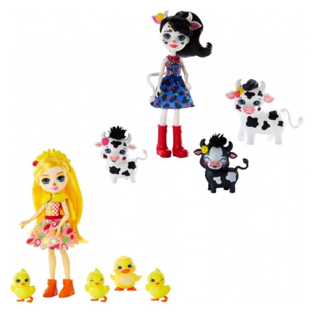 Чудовий подарунок дитині, що захоплюється мультиком “Енчантімалс”. Іграшку створено для дітей 4-8 років. Колекція “Сім’я з Врожайних гір” представлена двома наборами. До комплекту “Родина Коровки Кембрі” входить лялька-чарівниця та три теляти. Набор “Сім’я Качечки Діни” складається з дівчинки-перевертня та чотирьох милих каченят. Лялька заввишки 15 см виготовлена з якісного міцного пластику. Має довге волосся та детально промальоване обличчя. У Кембрі чорні плями на тілі, є хвостик та ріжки. Діна схожа на каченя: має червоний ніс та жовтогаряче волосся. Комплекти продаються окремо. Кольори та аксесуари у наборах можуть відрізнятися. Гра з ляльками Enchantimals вчить дитину піклуватися, розвиває фантазію та дрібну моторику. Артикул 795466.