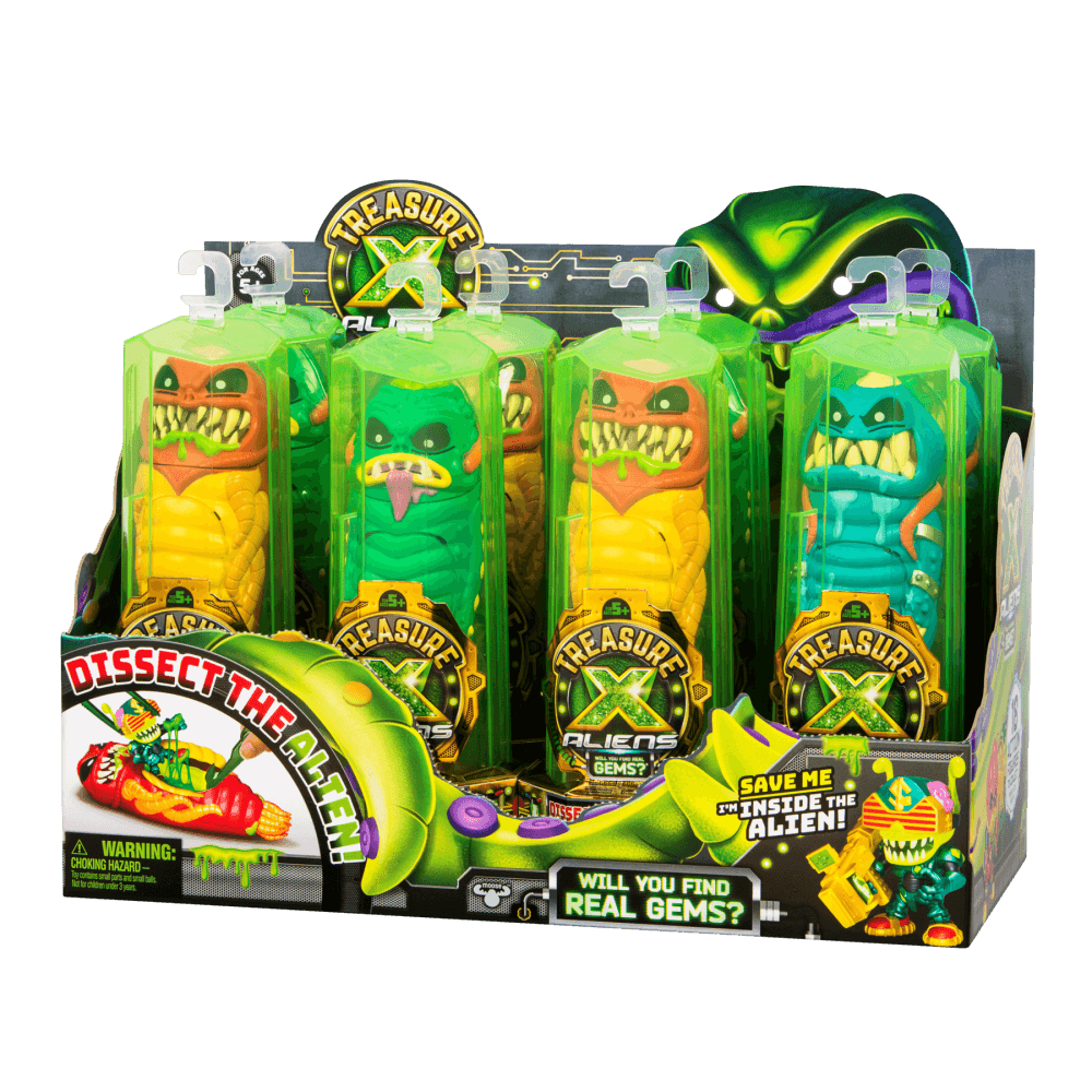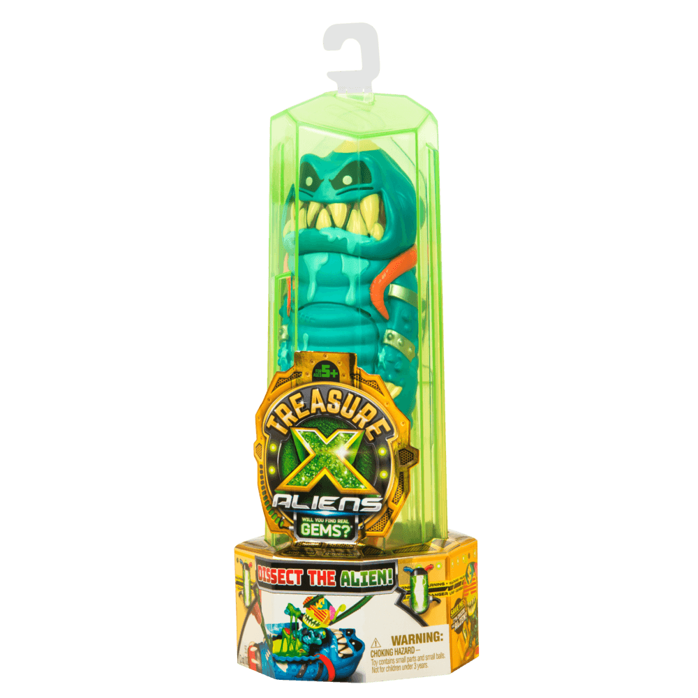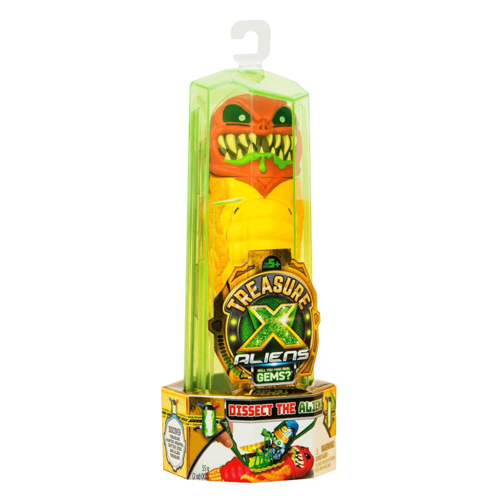 Treasure X Alien - дивовижний набір, що поєднує захоплююче розпакування, трендові слайми та космічні пригоди. У комплекті Ви знайдете: кристал, фігурку прибульця, його грудну клітину, пакетик зі слизом і контейнер, фігурку космічного мисливця та його зброю, скарб, позаземну істоту, інструмент, карту колекціонера. У наборі є все, щоб розпочати полювання на небезпечних космічних монстрів. А якщо зібрати всю колекцію, у Вас буде 19 скарбів, з яких один - справжній камінь з космосу. Гра з набором розвиває уяву, рекомендована дітям старше 5 років.