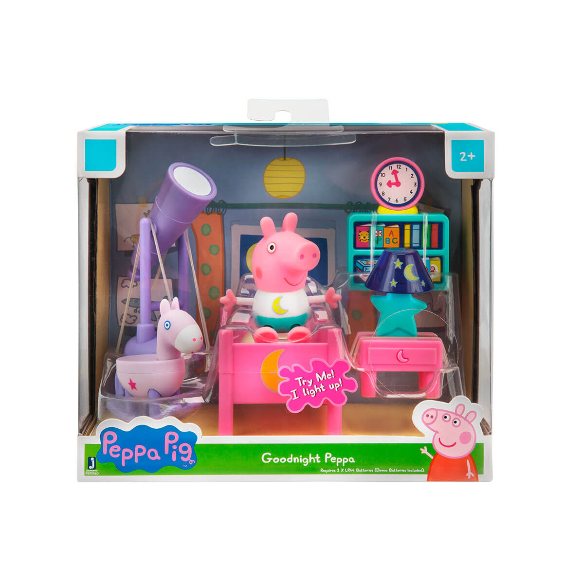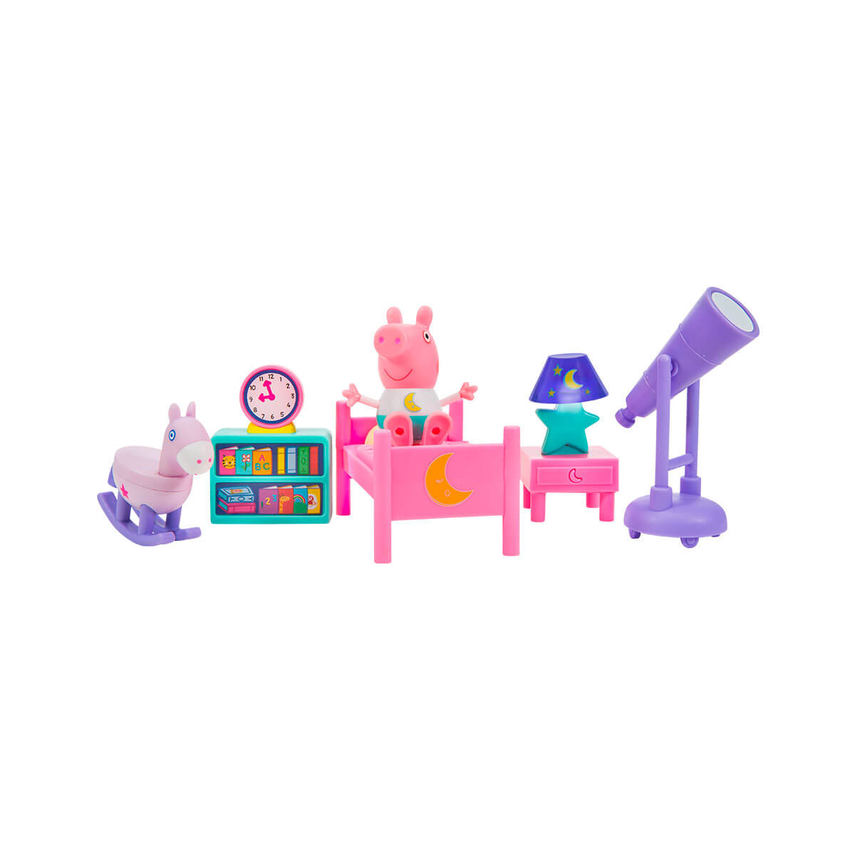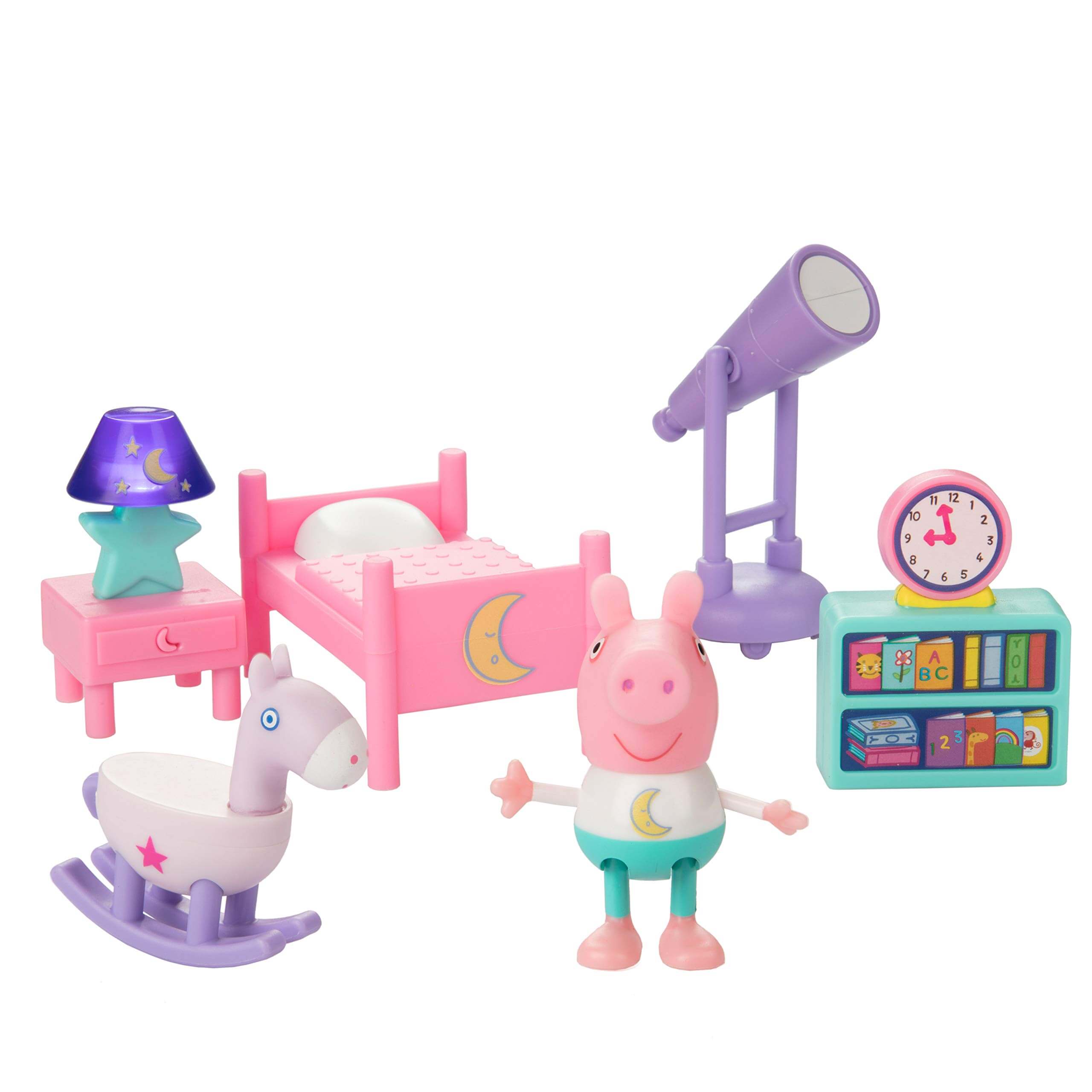 Проведіть час зі своїми улюбленими персонажами мультфільму "Свинка Пеппа"! Пеппа запрошує в гості в свою затишну спальню. В кімнаті Ви можете знайти все для гри: ліжечко, столик з лампою, книжкову шафу, телескоп і конячку-гойдалку. Фігурка Пеппи може сидіти, стояти, рухати ручками і ніжками. Настільна лампа - зі світлом, що вмикається. Зберіть великий будинок Пеппи, кожна кімната продається окремо. За допомогою такого набору діти освоюватимуть нові знання і навички спілкування, розвиватимуть світогляд і уяву. Для дітей у віці від 2 років.