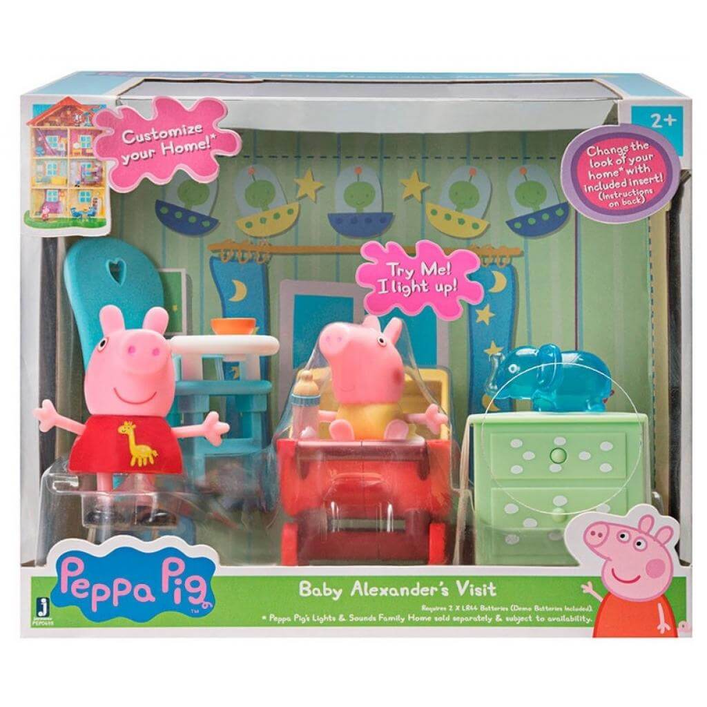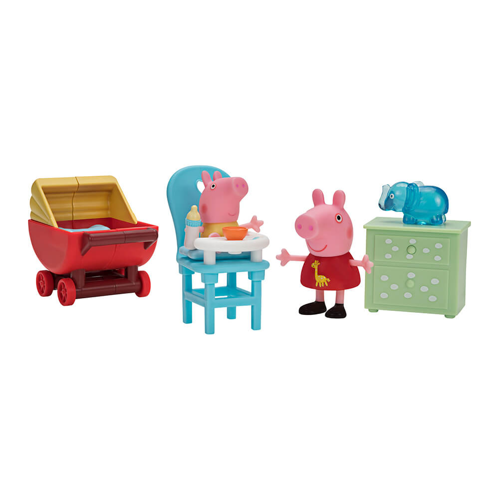 Проведіть час зі своїми улюбленими персонажами мультфільму "Свинка Пеппа"! Пеппа і Олександр запрошують в гості в свою затишну дитячу кімнату. В кімнаті Ви можете знайти все для гри: коляску для малюка, стільчик для годування, шафка і аксесуари.