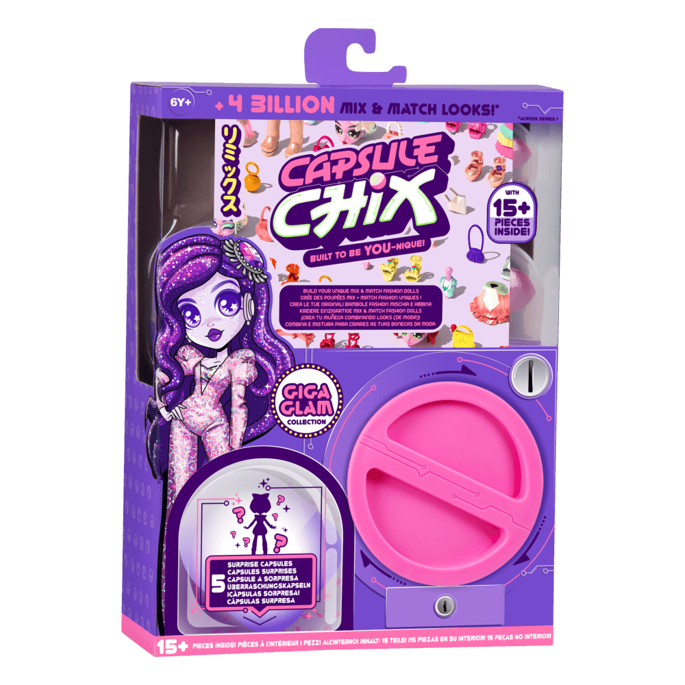 Capsule Chix - ігровий набір, з яким на Вас чекає цікаве розпакування і дивовижна лялечка в кінці. Комплект включає 5 капсул з елементами ляльки, підставку, гід колекціонера. Набір виготовлений з якісних та безпечних матеріалів. Зібрана лялечка Giga Glam має аж 14 точок артикуляції, тому дуже гнучка та рухлива. Її висота - 11 см. Цікаво, що всі елементи ляльок серії Capsule Chix взаємозамінні, тому з різних комплектів можна скласти якусь іншу дівчину.