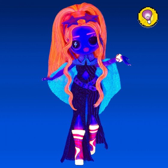 • Спрямуйте світло ультрафіолетового ліхтарика на ляльку O.M.G. та її одяг, щоб побачити сюрприз.