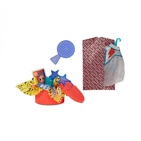 В ігровий набір входить: модна лялька L.O.L. Surprise! серії O.M.G. Dance, ліхтарик, одяг, коробка для капелюшка, сережки, вішалки для одягу, гребінець для волосся, чохли для одягу, підставка для ляльки, аксесуари, коробка-гардероб.