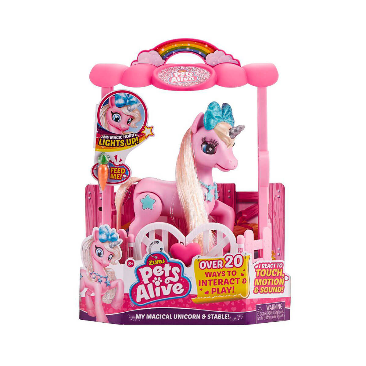 До набору входить: інтерактивний єдиноріг, будиночок, морквинка. Живлення: 3 батарейки типу ААА (до набору не входять). Рекомендовано для дітей віком старше 3 років.
