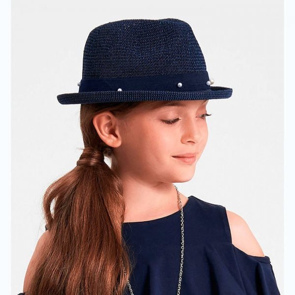 Елегантний літній капелюшок для довершеного образу юної леді, захисту від сонця. Виготовлений з триацетату, з імітацією плетіння соломою. Головний убір темно-синього кольору прикрашає синя стрічка та білі штучні перли. Наголовок трохи увігнутий, а невеликі борти по боках загнуті наверх. Розмір - 54.