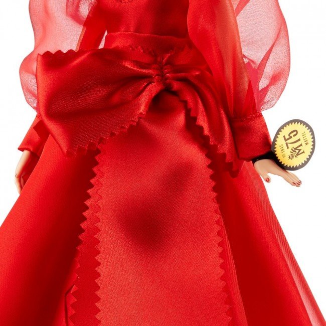 Неймовірна білявка одягнена в елегантну пишну шифонову сукню зі складною зубчастою обробкою. Волосся ляльки укладено в об’ємні локони та зібране в оригінальну зачіску, щоб підкреслити золоті сережки-обручі та червону губну помаду, яка так личить красуні і довершує її чарівний образ.