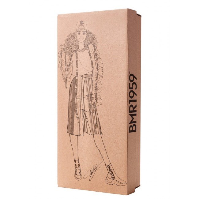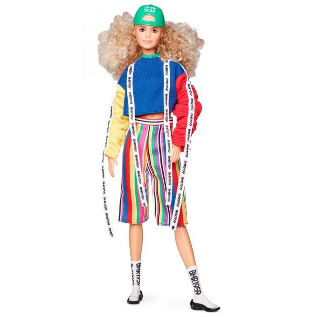 Колекція BMR 1959 - яскраве продовження фешн-історії бренду Barbie та втілення сучасних трендів. Ляльки серії демонструють зухвалий стріт-стайл. Від тенденцій 90-х років до нових орнаментів, форм та силуетів - ця серія про самовираження та стиль! Лялька BMR 1959 Кучерява блондинка вдягнена в стильні широкі смугасті шорти, кроп-топ різних кольорів зі стрічкою BMR та чорно-білі високі снікерси; завершує образ стильна зелена кепка. Колекційна лялька має 12 точок артикуляції. Стильний дизайн упаковки із зображенням ескізу ляльки нагадує коробку для взуття. В наборі до ляльки йде підставка з логотипом BMR 1959;.