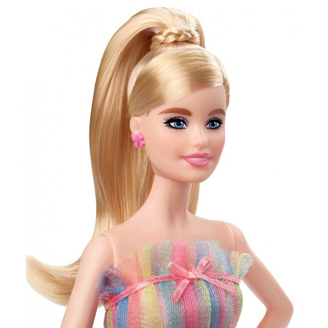 З Днем народження! Нарешті настав Ваш особливий день, і лялька з набору Barbie "Щасливий День народження" з радістю приєднається до веселого свята. Ця лялька принесе радість і зробить День народження чарівним. Вона одягнена у багатошарову сукню із смужками кольору веселки, блискітками і витонченими бантиками. На упаковці є місце для написання побажань, що робить ляльку Barbie ідеальним подарунком. І, звичайно ж, потрібно запалити свічки і загадати бажання. У комплект входить підставка для ляльки і сертифікат справжності. Кольори та аксесуари можуть відрізнятися.