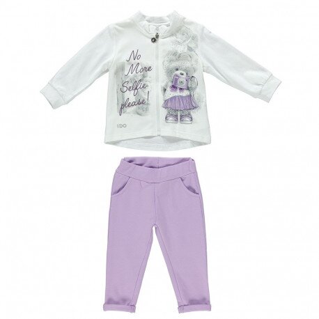 Зручний та теплий трикотажний комплект у ніжній кольоровій гамі стане незамінним варіантом Вашій дівчинці для щоденних прогулянок. М'які бузкові штани на еластичному поясі з вшитою гумкою мають вилоги на халошах та врізні кишені. Біла кофта на блискавці спереду має подвійну смугасту гумку на рукавах та по горловині. Декорована милим принтом у бузковому та сірому кольорах. Матеріал - 93% бавовна, 7% еластан. Колір - кораловий. Дитячий одяг бренду iDO - це висока європейська якість і кращі модні тренди.