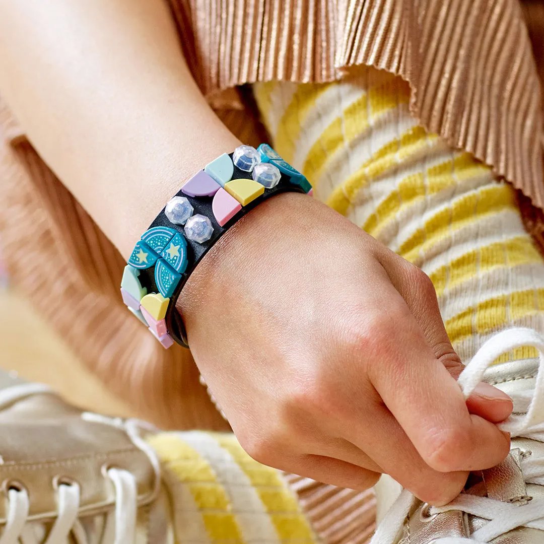 Здивуйте маленьку модницю оригінальним браслетом LEGO® DOTS! Набір для творчості розроблений для дітей 6-10 років. Складається з м'якого пластикового ремінця та 32-х невеликих накладок. Чорна основа, на яку кріпляться елементи, не боїться вологи, регулюється на руці за допомогою п'яти отворів. Довжина ремінця - 20 см. Накладки мають різну форму та колір. На них зображені зірки та планети. Елементи витримують багаторазове закріплення. В процесі рукоділля розвивається навик конструювання, логічне мислення, дрібна моторика, креативність, фантазія. Завдяки шиповим з'єднанням, малеча легко закріпить елементи на ремінці. Викладений з накладок візерунок буде унікальним. А дівчата так люблять бути неповторними! Артикул 124490.