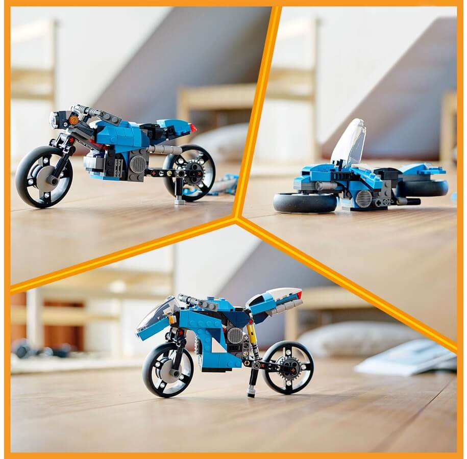 Набір «Супербайк» надихає на нескінченну творчу збірку, адже в ньому є цілих три моделі: сучасний мотоцикл, класичний мотоцикл і футуристичний ховербайк. Розміри транспортного засобу - 11 см у висоту, 19 см в довжину і 6 см в ширину. Він досить портативний, щоб грати вдома або взяти з собою до друзів. У супербайка є кермо, що повертається, робоча підвіска і підніжка, а у класичного мотоцикла - підніжка, щоб його можна було з гордістю виставити на загальний огляд. Набір з іграшковими мотоциклами - ідеальна нагорода для дітей у віці від 8 років, у яких є пристрасть до іграшкової техніки і креативного творення.