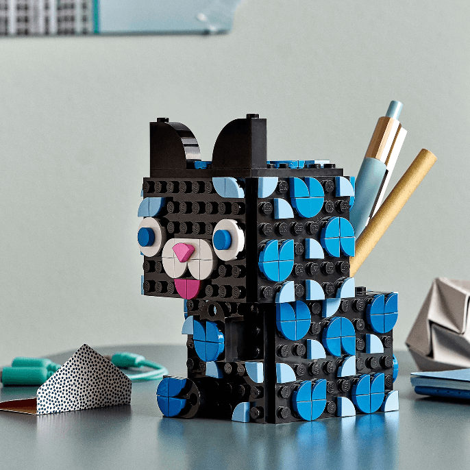 Здивуйте дитину оригінальним конструктором-мозаїкою LEGO® DOTS! Набір для творчості розроблений для дітей старше 6 років. Складається з 451 елемета чорного, блакитного, білого і рожевого кольорів. Плитки виготовлені з якісного, безпечного пластика, який не боїться вологи, витримує багаторазове закріплення на основі. З різних за кольором мозаїчних елементів (тайлів) можна зібрати настільний тримач для олівців у вигляді кота 2-ма таємними відділеннями. У висоту підставка під канцелярію досягає 12 см, в ширину 7 см, в довжину 7 см. Отриманий в результаті дизайн буде унікальним. Завдяки з'єднанням, елементи просто закріпити на поверхні. В процесі рукоділля розвивається навик конструювання, логічне мислення, дрібна моторика, креативність, фантазія. У комплект входить коробка для сортування та зберігання тайлів.