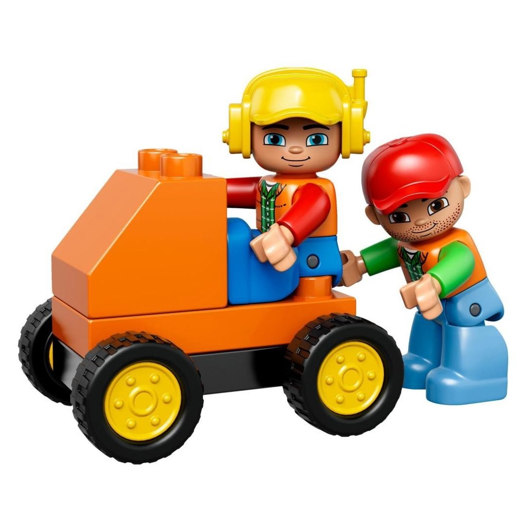Знайомте малюка з професіями та спецтранспортом за допомогою конструктора LEGO® DUPLO®! Ігровий набір розроблений для дітей 2-5 років. Включає 67 невеликих барвистих блоків, з яких можна зібрати вантажівку, гусеничний бульдозер, підйомний кран і будівлю. Іграшка продумана до дрібниць: в комплекті є огороджувальні стовпчики, відбійний молоток, лопата, тачка, кубики із зображенням цегли. У комплекті з деталями йдуть три фігурки будівельників в захисних касках. Конструктор для самих маленьких розвиває дрібну моторику, формує початкове вміння будувати. В процесі гри малюк вчиться взаємодіяти з навколишнім світом, створювати уявні ситуації. Нехай малюк уявить себе водієм бульдозера, що розчищає майданчик під майбутню будівлю, або кранівником, що захоплює грейфером блоки для будівництва. Невеликими за розміром фігурками зручно грати: вони вміщаються у дитячу ручку. А шипове з'єднання спрощує збір конструкції. Артикул 123681.