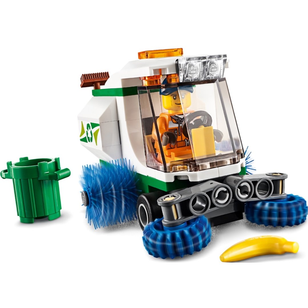 Організуйте генеральне прибирання на вулицях LEGO City! Ігровий набір рекомендований дітям від 5 років. Включає 89 барвистих блоків, з яких можна побудувати підмітально-прибиральну машину. Іграшка продумана до дрібниць. У вантажівки-двірника обертаються щітки. Ззаду знаходиться контейнер для сміття з дверцями. У комплекті є відро, щітка, черпак, банан, а також фігурка водія-прибиральника. З тематичними конструкторами "Лего" не буває нудно! Вони виготовлені з міцного, безпечного і яскравого пластика. Елементи з'єднуються за допомогою шипів і пазів, що забезпечує міцність конструкції. Гра формує будівельні навички дитини, розвиває уважність, логіку, дрібну моторику і фантазію. Артикул 124476.