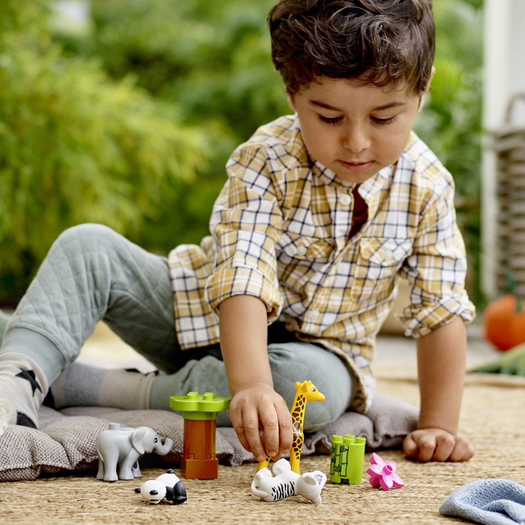 Познайомте дитину з дивовижним світом екзотичних тварин! Ігровий набір LEGO® DUPLO® Wild Animals розроблений для дітей 2-3 років. Він складається з чотирьох іграшкових дитинчат тварин: слона, жирафа, тигреня та панди. У комплект, крім звірят, входять барвисті та реалістичні фігурки бамбукових пагонів, дерева та рожевої квітки. Конструктор для самих маленьких розвиває дрібну моторику, формує початкове вміння будувати. В процесі гри малюк вчиться взаємодіяти з навколишнім світом, створювати уявні ситуації. Невеликими за розміром фігурками зручно грати: вони вміщуються у дитячу ручку. А шипове з'єднання спрощує збір конструкції. Артикул 124370.