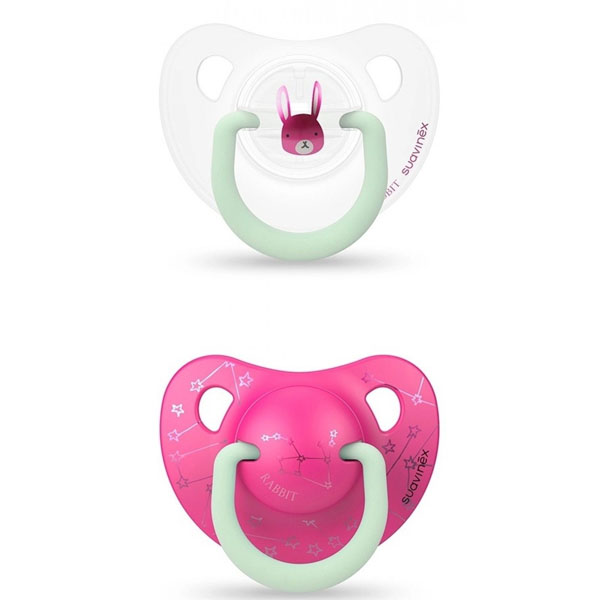 Suavinex Рожевий зайчик - пустушка анатомічна нічна. Світиться у темряві. Соска м'яка і гнучка, виготовлена із силікону - міцного і еластичного матеріалу.