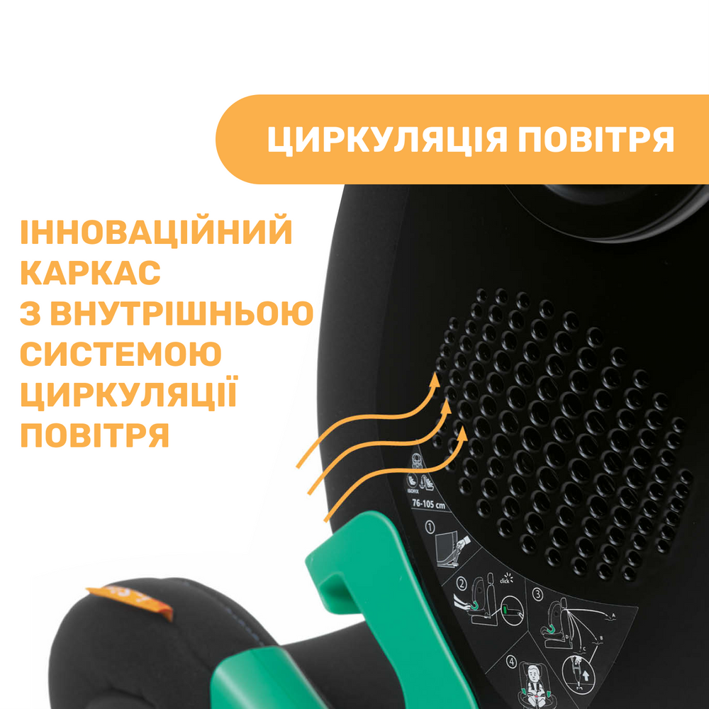 Комфорт: Fit-Kit – система ярликів-підказок допомагає зрозуміти віковий діапазон використання, підказує як правильно встановити автокрісло та використовувати систему ременів безпеки. 3 рівні нахилу сидіння та 13 рівнів висоти підголівника для адаптації автокрісла під ріст дитини. Інноваційний каркас із внутрішньою системою циркуляції повітря. Знімний анатомічний вкладиш забезпечує зручність і комфорт (використовується для дітей зростом від 76 до 87 см).