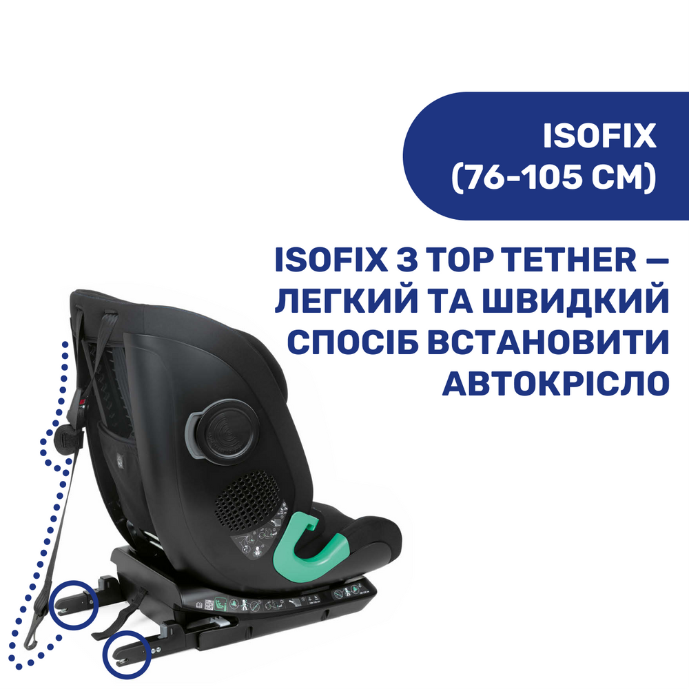 Безпека: ISOFIX – спеціальна система кріплення до металевих петель за допомогою роз'ємів ISOFIX та якірного ременя Top Tether для більшої стійкості й надійної фіксації крісла з мінімальними зусиллями. Side Safety System – додаткова система захисту від бокового удару. 5-точкові ремені безпеки з м'якими накладками.