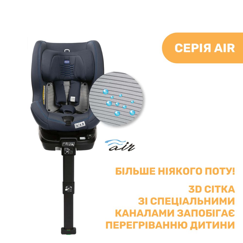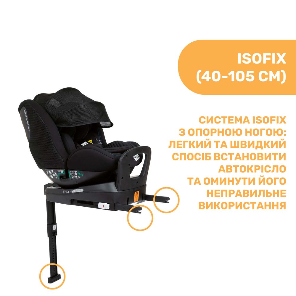 Комфорт: Fit-Kit – система ярликів-підказок допомагає зрозуміти віковий діапазон використання, підказує як правильно встановити автокрісло та використовувати систему ременів безпеки. Обертання сидіння на 360° – полегшує перехід від положення "проти руху" до положення "по ходу руху". Забезпечує зручне положення для висадження дитини. 6 рівнів нахилу сидіння та регулювання висоти підголівника дозволяють адаптувати автокрісло під вік дитини. Знімний сонцезахисний козирок з інноваційного 3D текстилю. Інноваційний каркас із внутрішньою системою циркуляції повітря. 3D AirMesh – текстиль з повітряними каналами, які прискорюють відведення вологи та забезпечують максимальну вентиляцію. Знімний анатомічний вкладиш для дітей від народження (використовується зростом до 75 см).