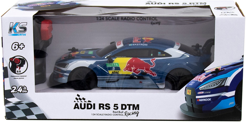 Audi RS 5 DTM Red Bull – радіокерована ліцензійна копія автомобіля в масштабі 1:24.У автомобілів KS DRIVE висока деталізація: робочі фари, робоча пружинна підвіска та якісні шини, виготовлені за ліцензією власника автомобільного бренду.