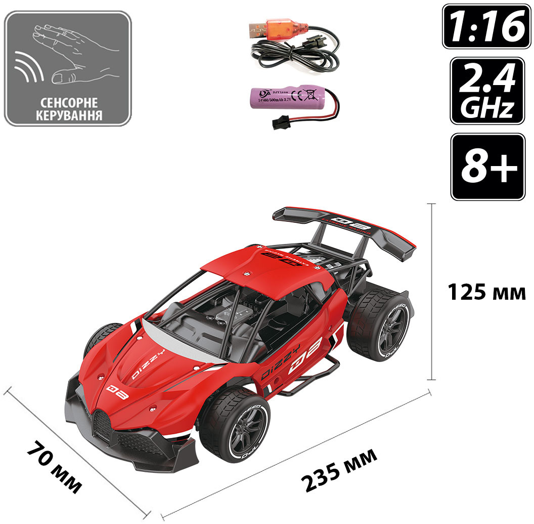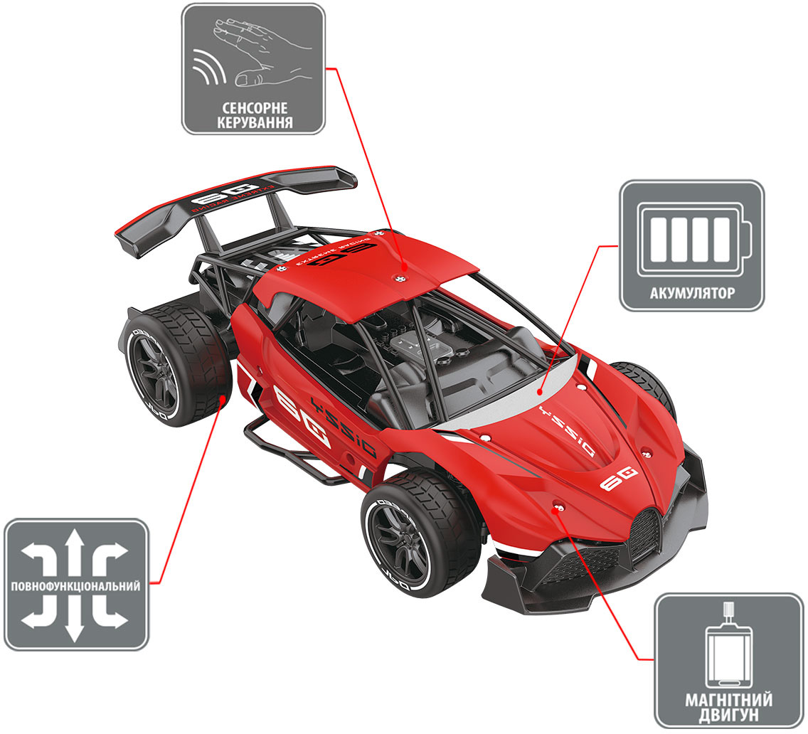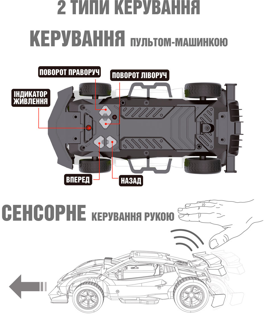 Машинка Sulong Toys Gesture Sensing Dizzy має 2 типи керування! За допомогою пульта керування. Сенсорне керування. Необхідно провести рукою над сенсорними датчиками (знаходяться спереду та ззаду моделі), щоб машинка поїхала. Такі характеристики дозволяють автомобілю з р/к та з сенсорним керуванням імітувати маневри справжньої машини, забезпечувати стійкість і краще зчеплення автомобіля з дорогою.